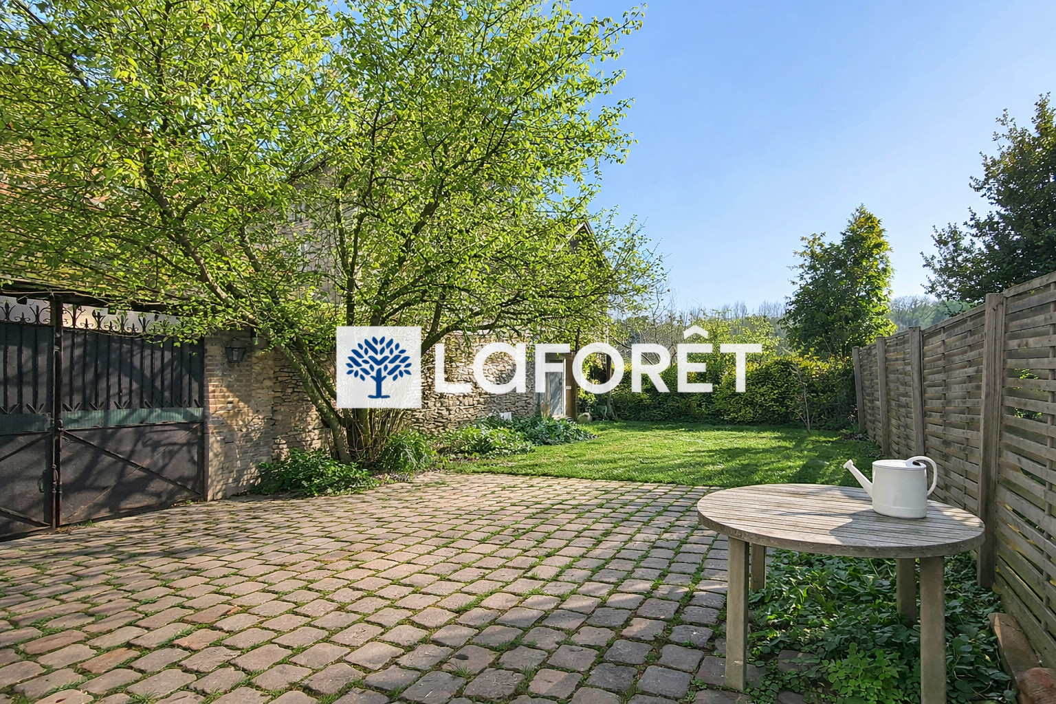Une cour pavée accueille deux véhicules en toute commodité. Un espace gazonné clos de murs et de grillages, agrémenté d'arbres matures et de plantations fleuries, invite à profiter des beaux jours dans un cadre intime et préservé. Un vrai jardin de village, à la fois pratique et apaisant.