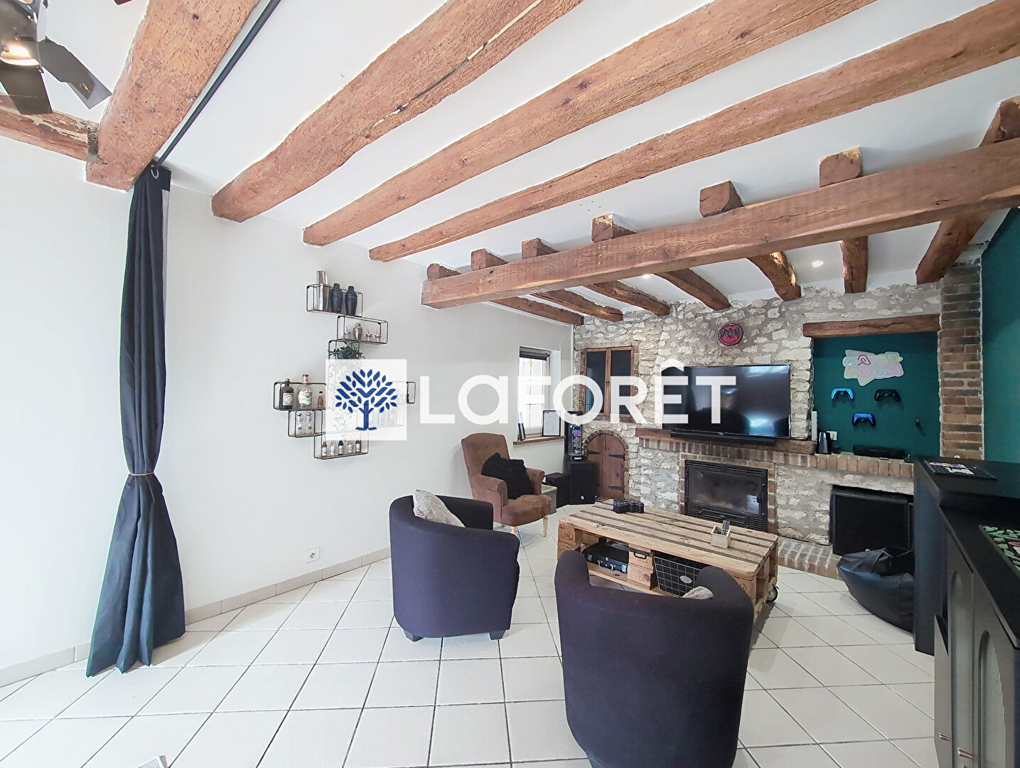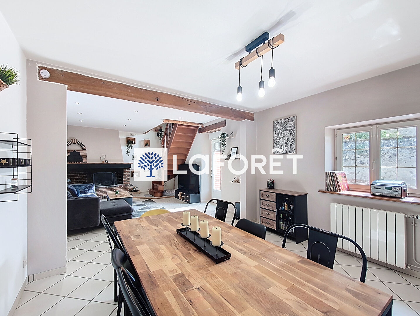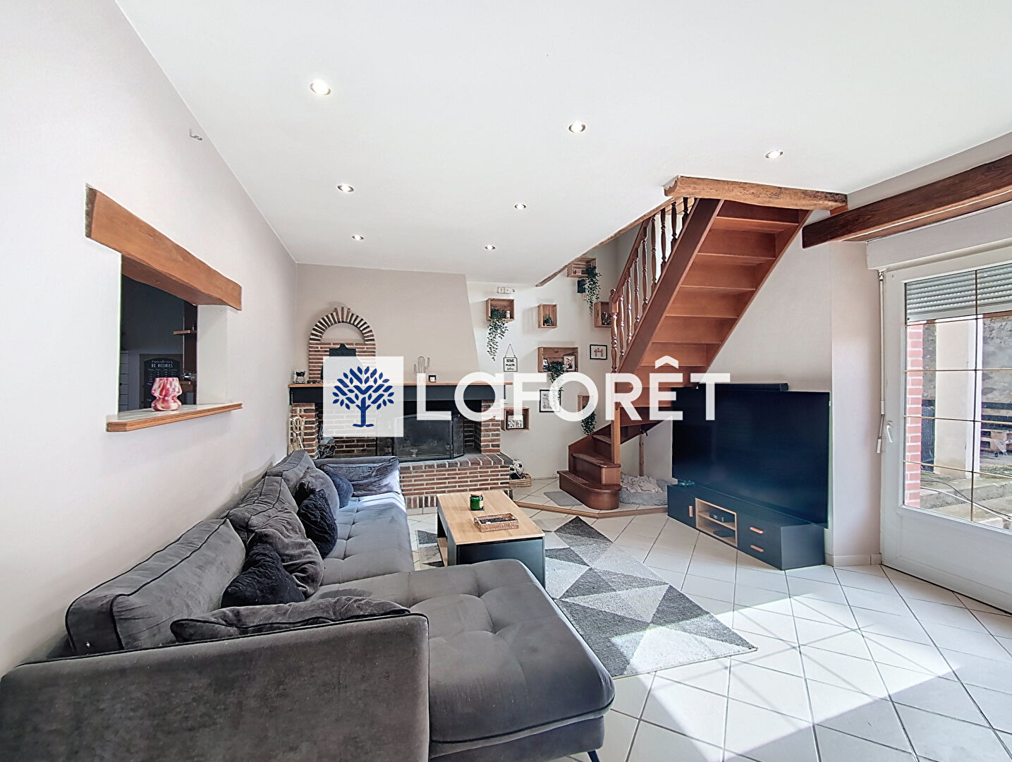 Le spacieux salon-séjour en "L" d'environ 59 m² impressionne par son caractère chaleureux : poutres apparentes, cheminée en briques et insert bois, sol en carrelage clair.