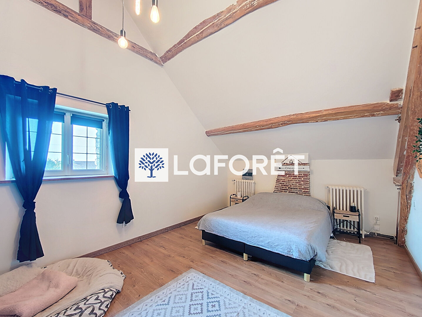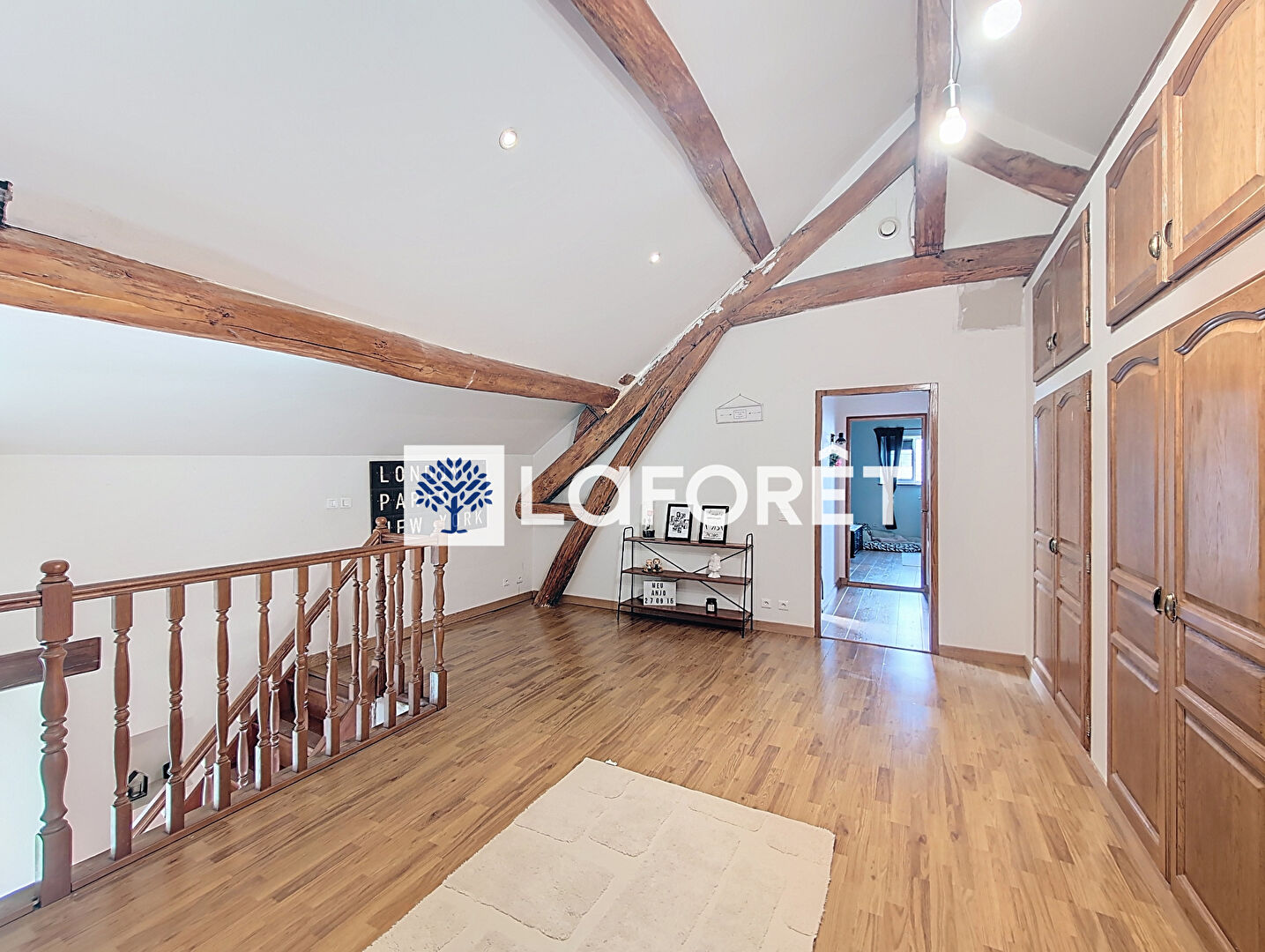À l'étage, le palier généreux en parquet bois clair, sous de belles poutres de charpente, dessert trois chambres lumineuses dont une avec espace dressing aménagé et une autre pouvant être transformée en suite parentale.