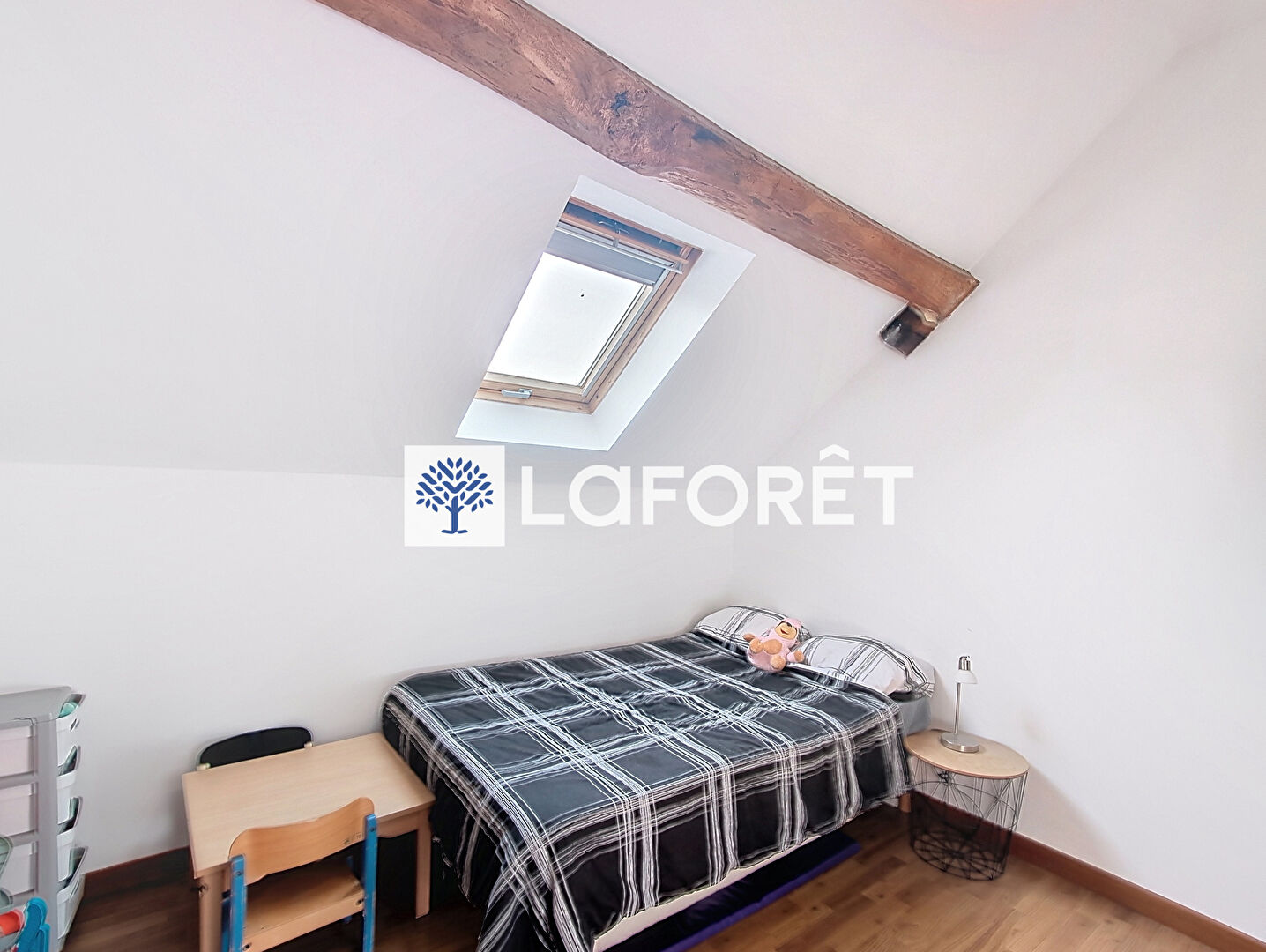 Les fenêtres de toit apportent une lumière naturelle généreuse dans les chambres et dans la salle d'eau qui réunit douche, baignoire et WC dans une même pièce.