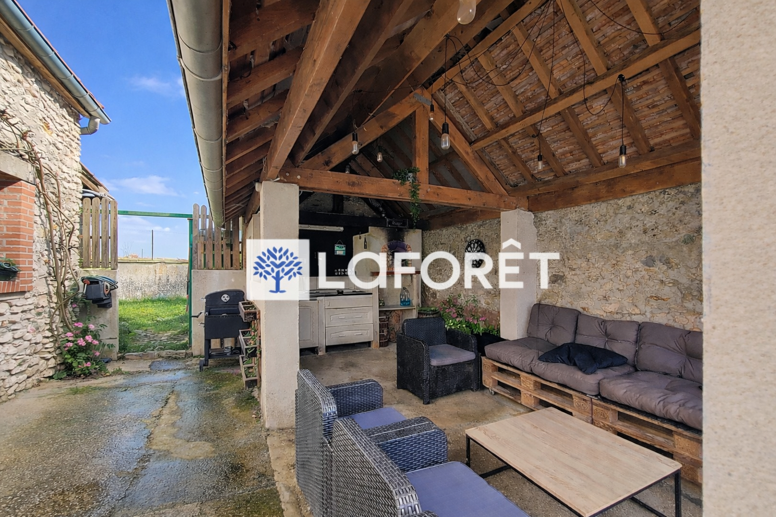 Dehors, le préau à charpente bois apparente et tuiles constitue un véritable espace de vie extérieur à part entière, avec son four à pizza, parfait pour les longues soirées estivales en famille ou entre amis.