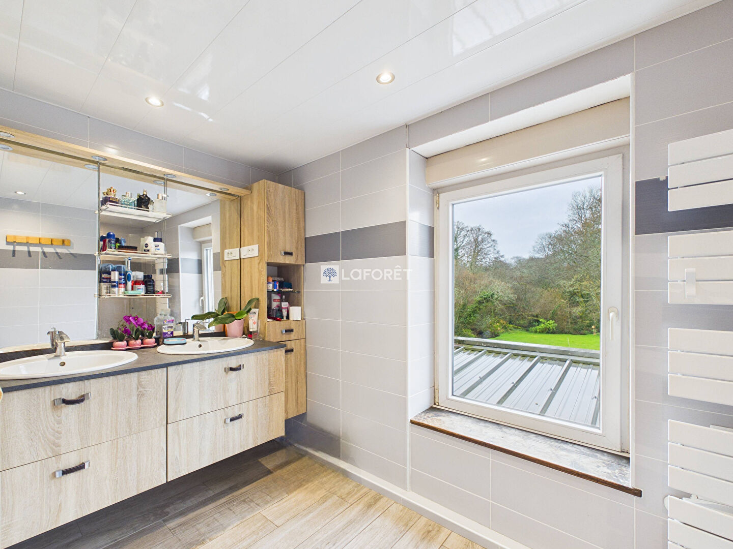 Au premier un palier dessert une belle chambre avec vue sur le jardin et une grande salle de bain avec baignoire, douche WC et double vasques.