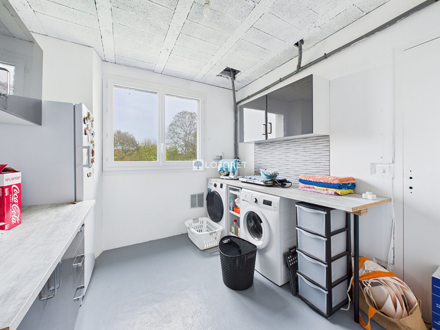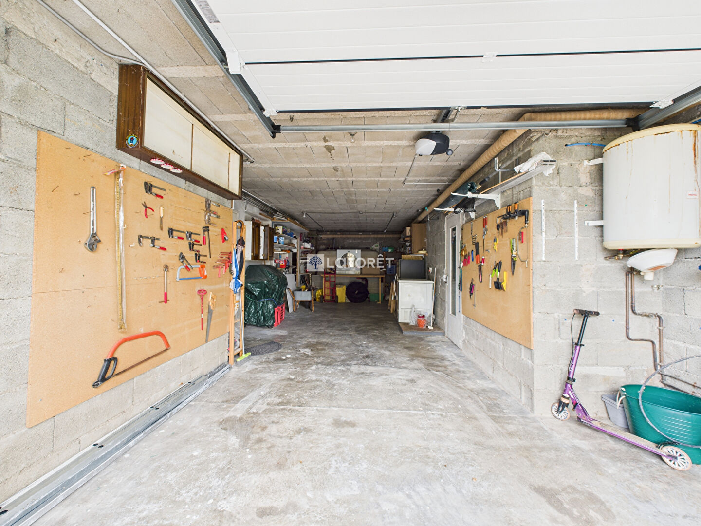 Un grand garage pouvant accueillir 2 véhicules avec espace de stockage.