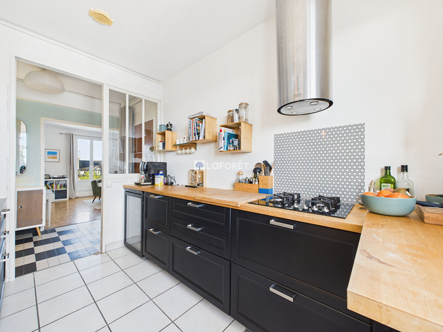 La cuisine aménagée et équipée, semi-ouverte, séduit par sa verrière contemporaine et sa porte coulissante.