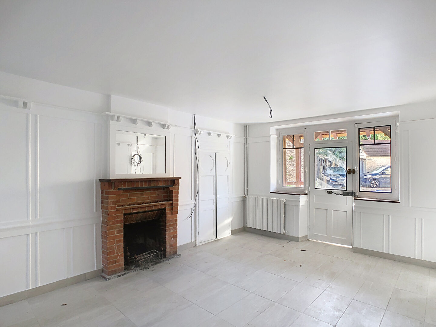 En rez de chaussée, une entrée, une cuisine et un séjour avec cheminée à foyer ouvert.