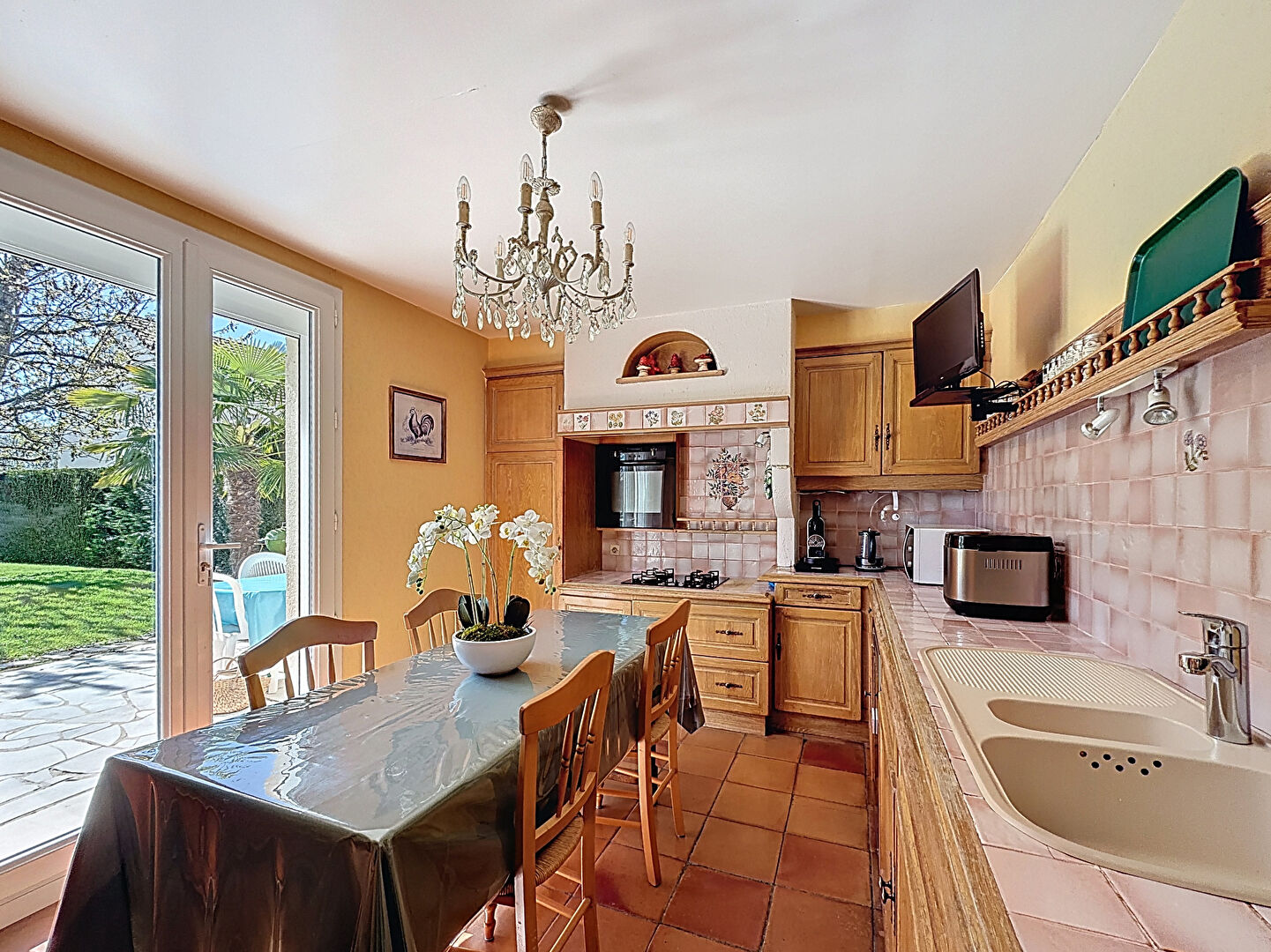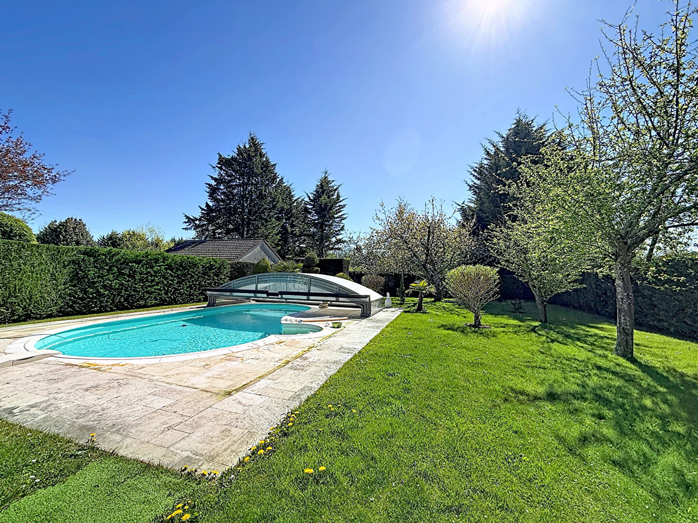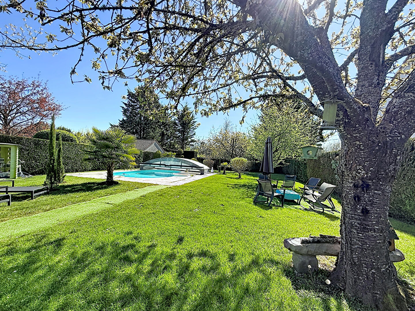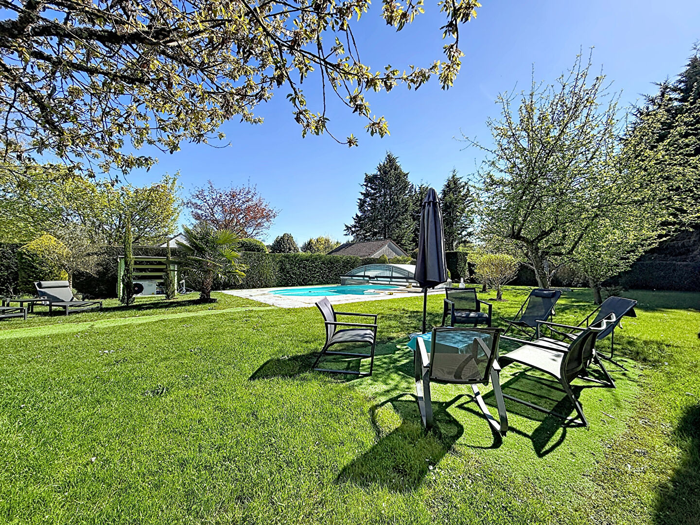 La terrasse exposée plein Sud / Sud-Ouest, équipée d'un store banne, s'ouvre sur un vaste jardin arboré et ensoleillé. Espace privilégié pour d'agréables journées de printemps et d'été : la piscine chauffée par pompe à chaleur, protégée par son abri, promet des saisons prolongées dans un cadre intimiste et verdoyant.