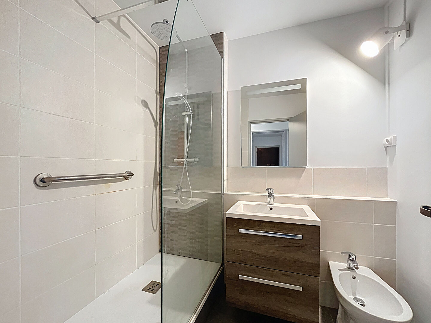 Un dégagement dessert une cuisine fermée, une salle d'eau avec douche à l'italienne et bidet, un wc indépendant et une chambre.