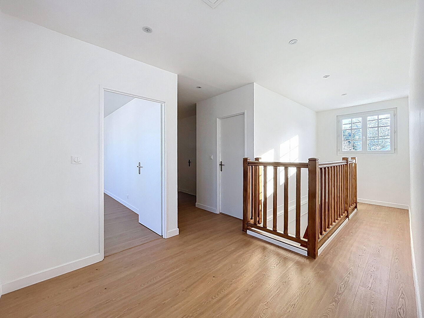 À l'étage : Un palier pouvant faire office de salle de lecture, salle de jeux ou de bureau, trois grandes chambres avec rangements, une salle de bains et un WC.