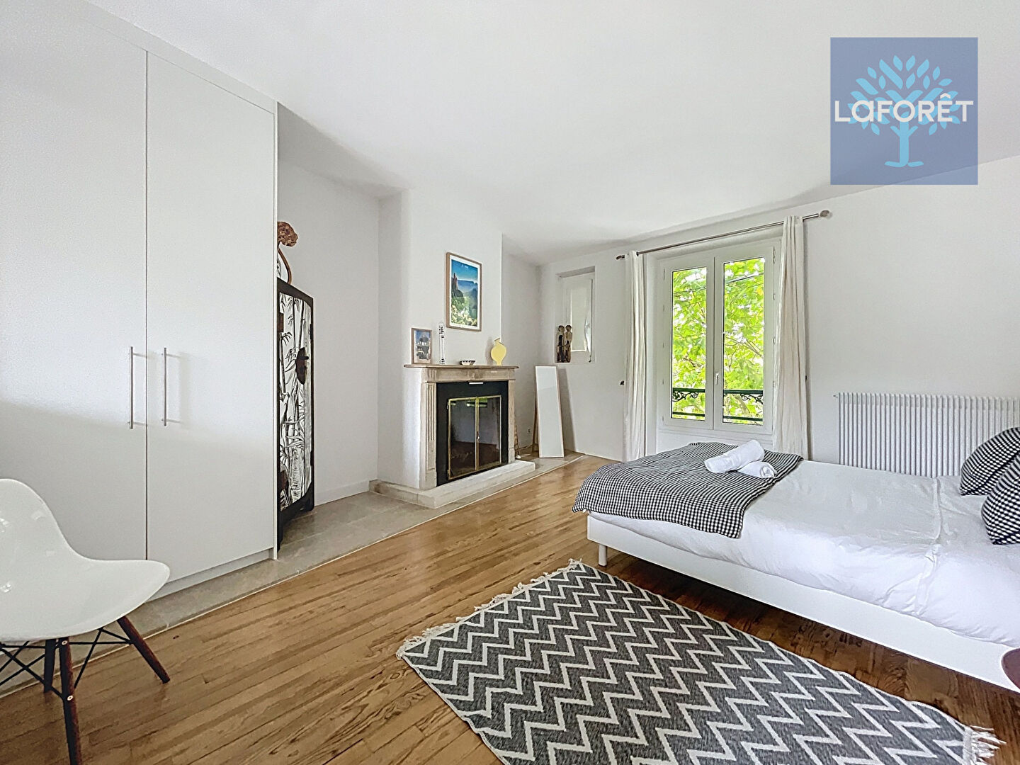 - Au premier étage : Deux belles chambres avec lit double et placards, une grande chambre avec dressing, bureau et cheminée, une vaste salle de bains avec WC et une salle d'eau.