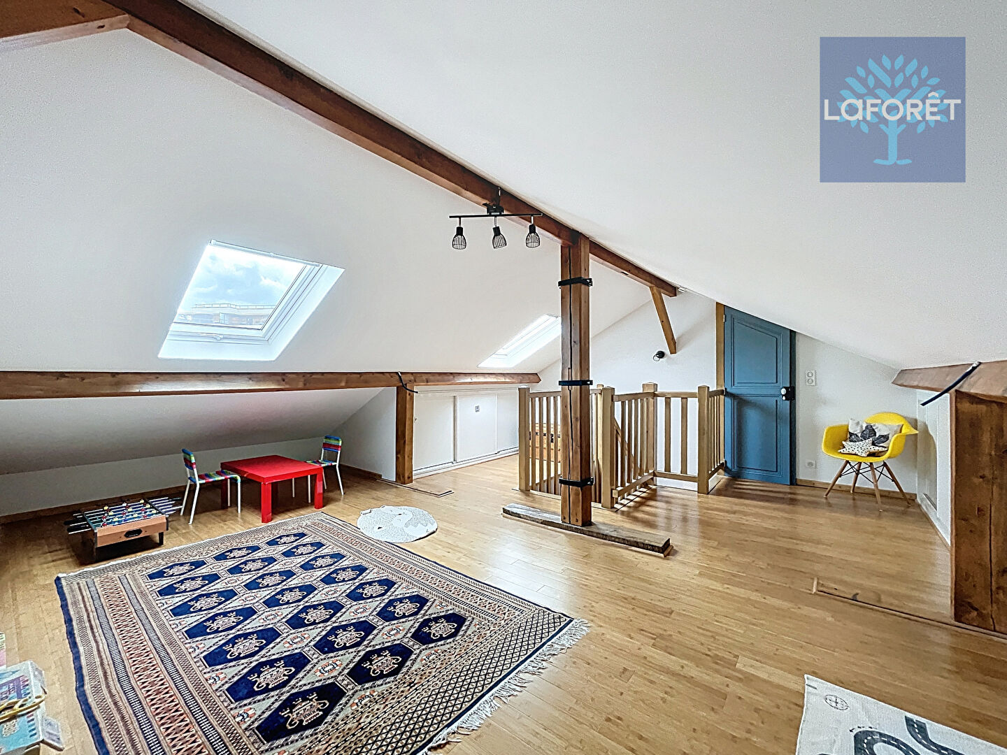 - Au deuxième étage : Un grand espace pouvant faire office de salle de jeux ou bureau, une chambre.