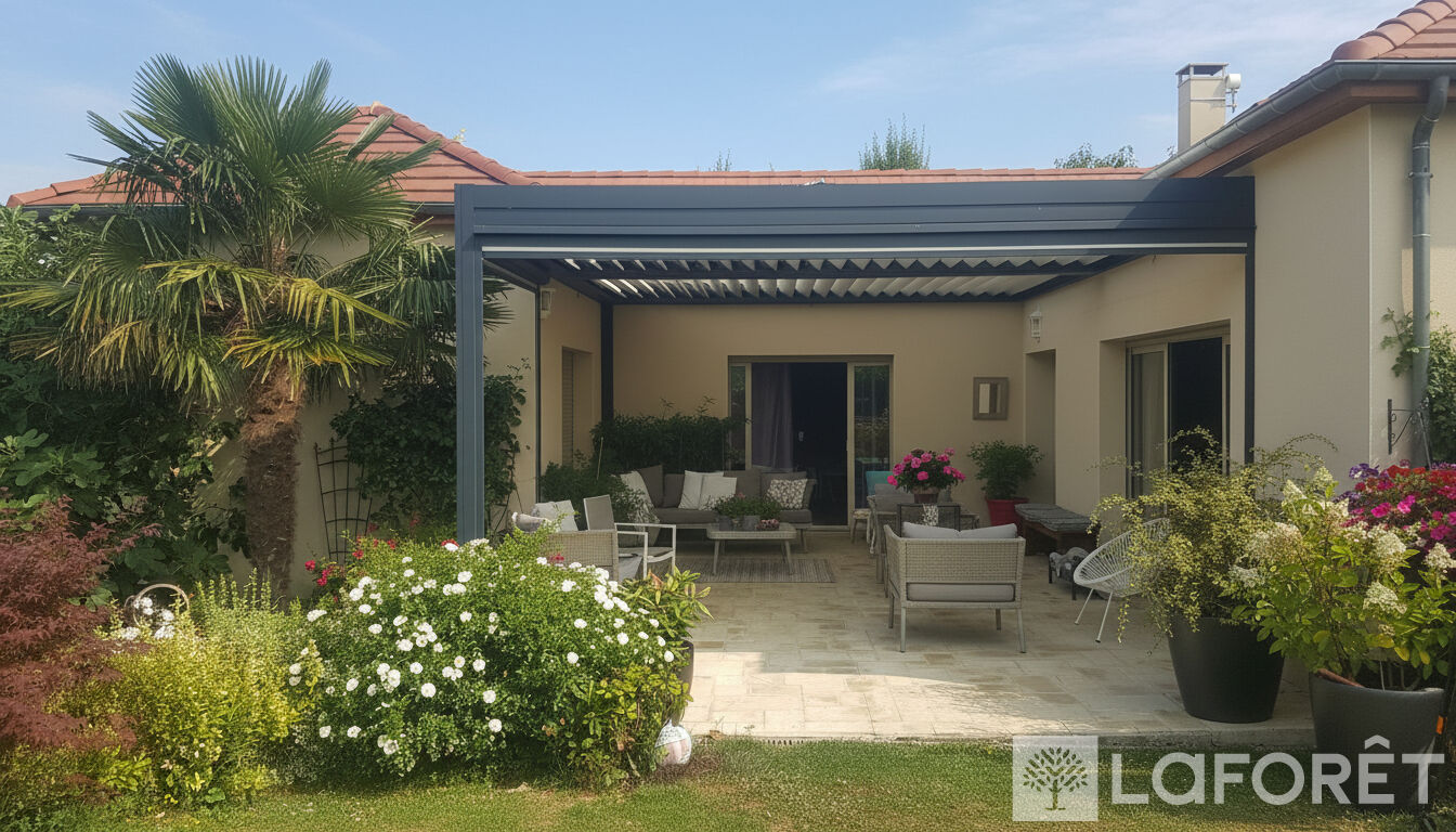 Le terrain arboré invite à la détente et s'accompagne d'une pergola bioclimatique qui prolonge agréablement la maison à la belle saison. L'ensemble bénéficie de matériaux de qualité et d'un confort moderne.