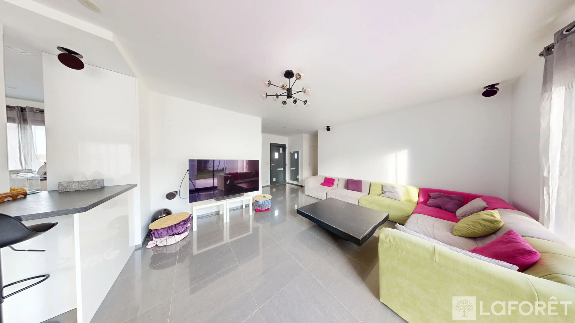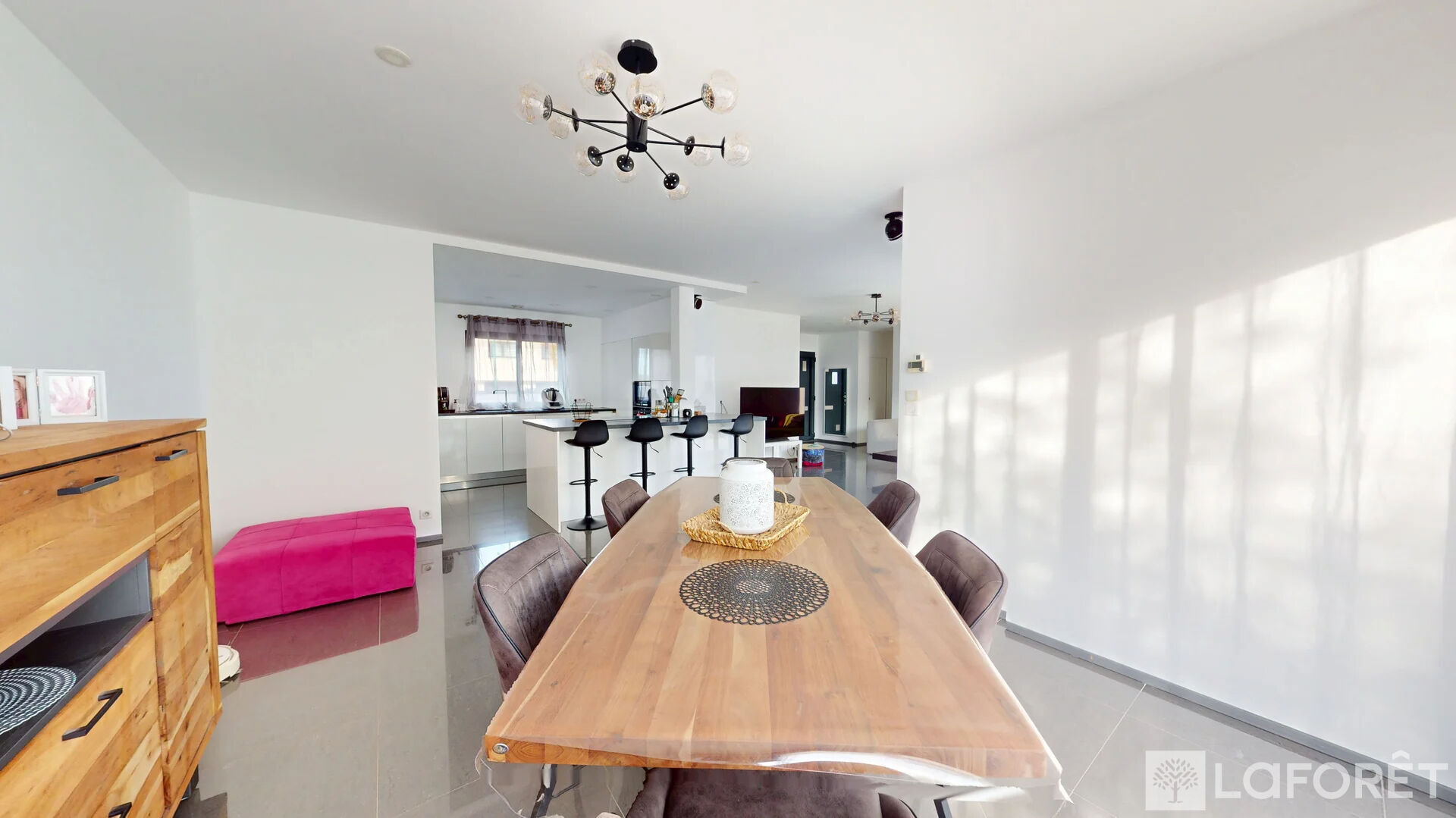 Dès l'entrée, vous serez séduits par ses volumes généreux et sa luminosité exceptionnelle, renforcée par de larges menuiseries en aluminium de haute qualité. La pièce de vie, spacieuse et chaleureuse, s'ouvre sur une cuisine moderne entièrement ouverte, parfaite pour recevoir et partager des moments conviviaux.