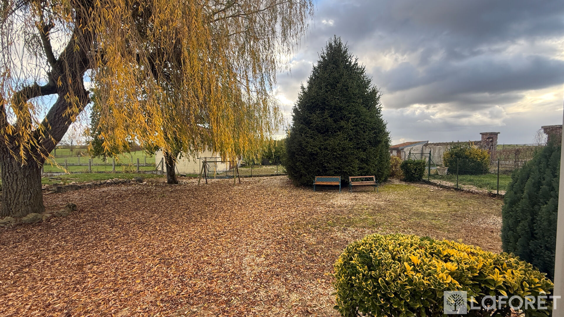 La maison dispose également d'un garage, d'une terrasse et de deux cabanons de jardin.