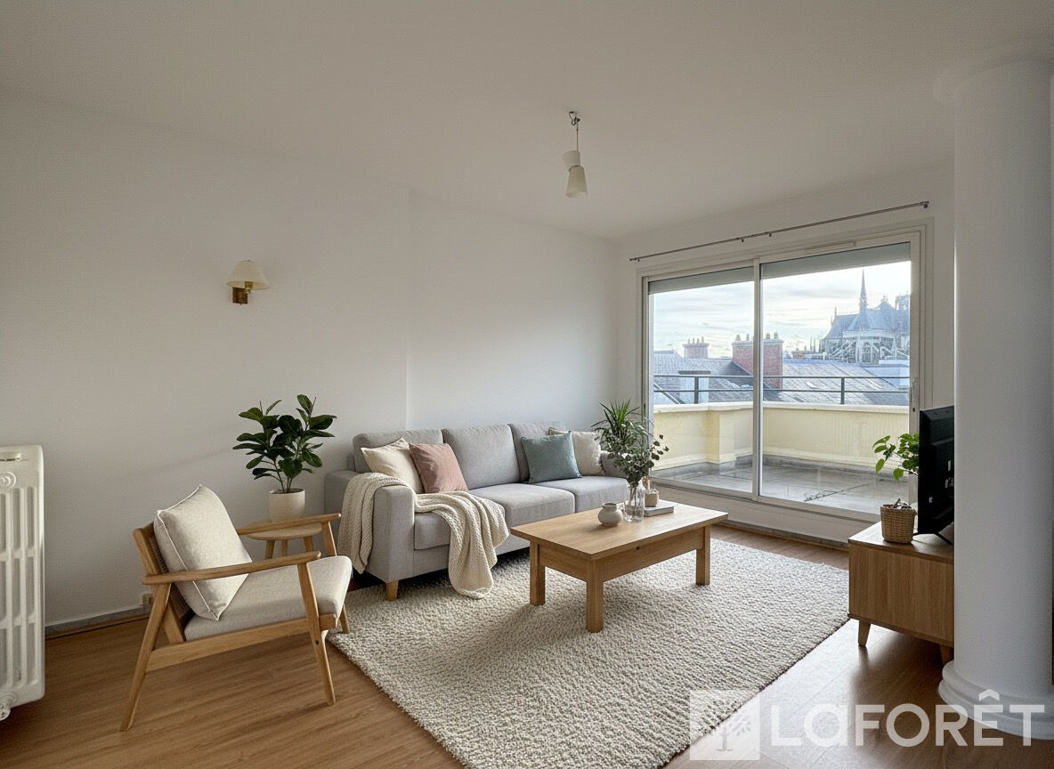 Le coeur de l'appartement reste sans conteste le séjour, prolongé par une magnifique terrasse offrant une vue imprenable sur la Cathédrale de Reims ? un panorama rare et privilégié, idéal pour des moments hors du temps.