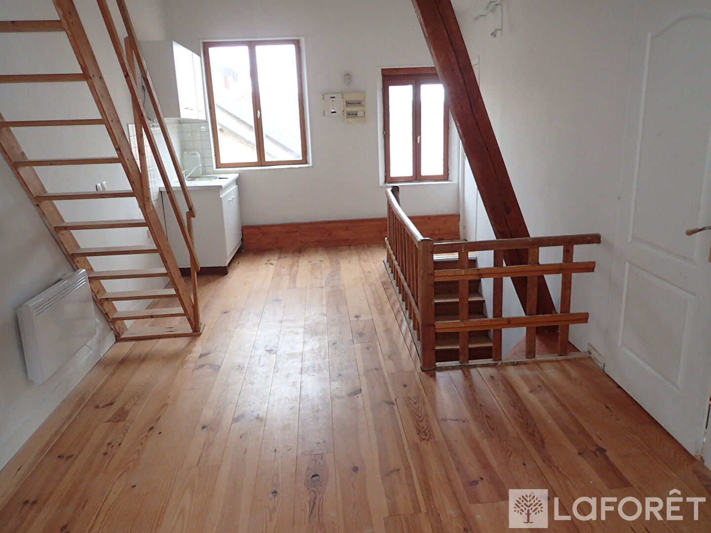 Au deuxième étage, un appartement de type F2 composé d'un séjour avec cuisine, d'une chambre, d'une salle d'eau avec WC ainsi que d'une mezzanine offrant un espace supplémentaire très appréciable, appartement loué 400€ hors charges.