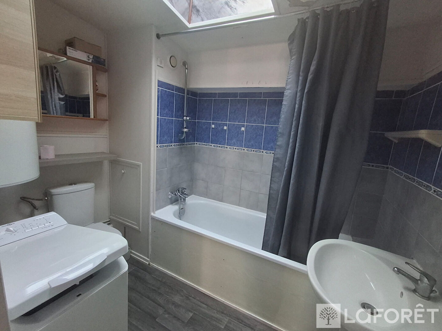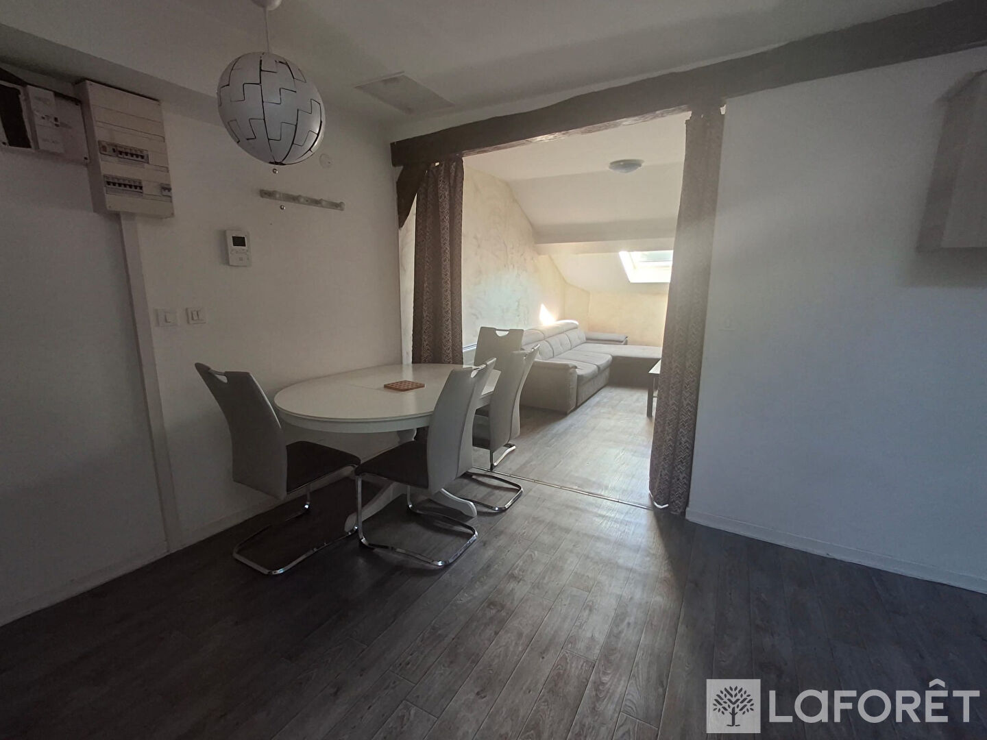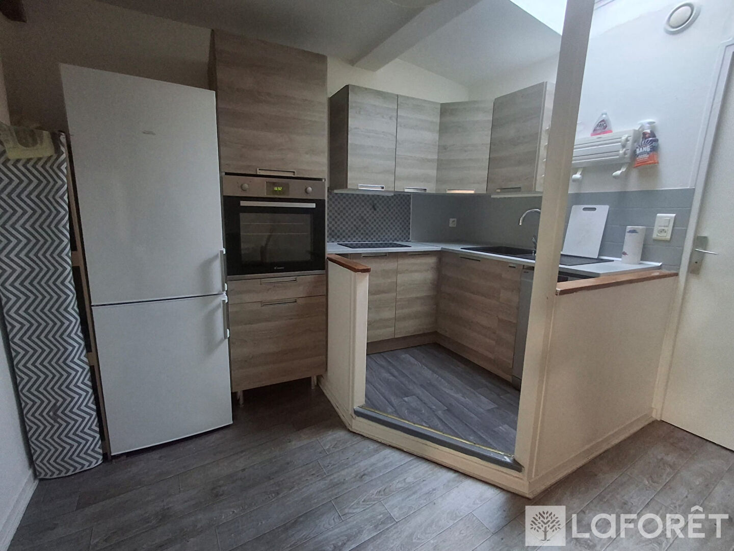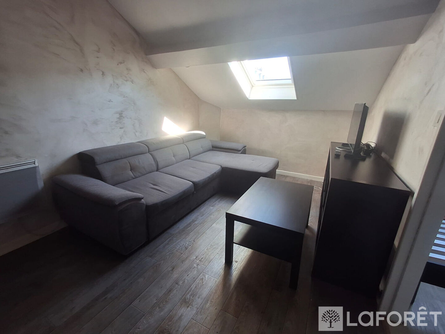 Il se compose d'un grand séjour lumineux offrant plusieurs espaces distincts avec une cuisine d'un côté, un espace salon et un coin salle à manger. L'appartement dispose également d'une chambre avec placard ainsi que d'une salle de bain avec toilettes.