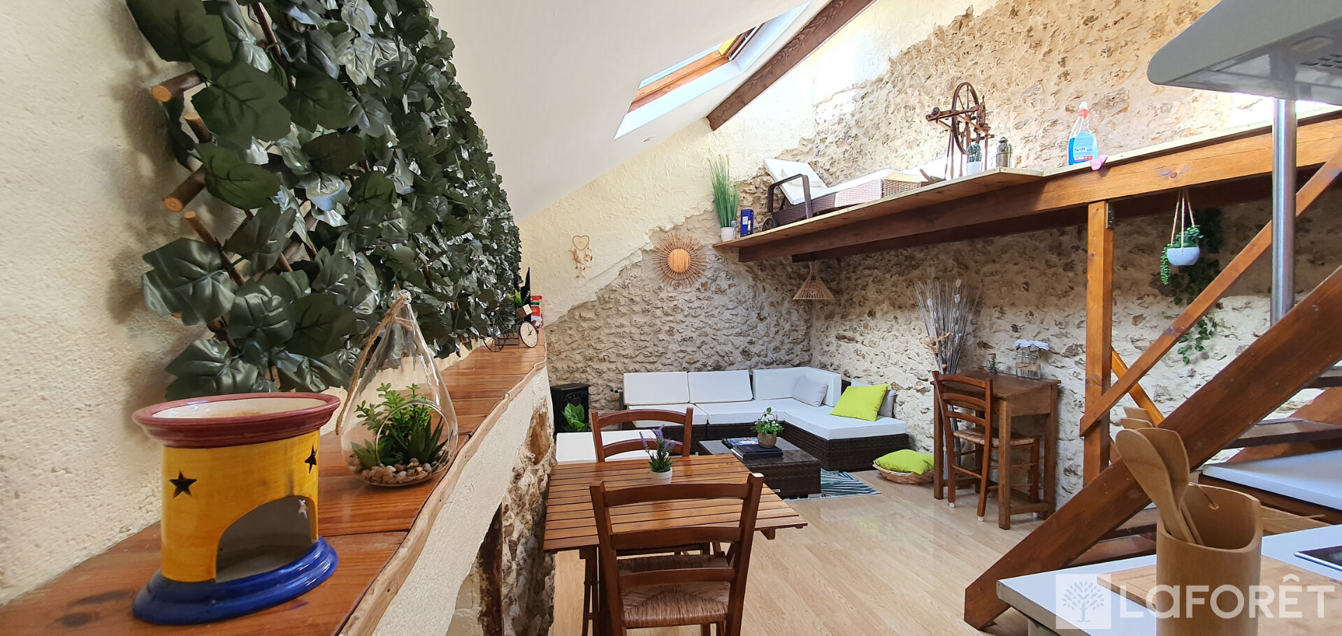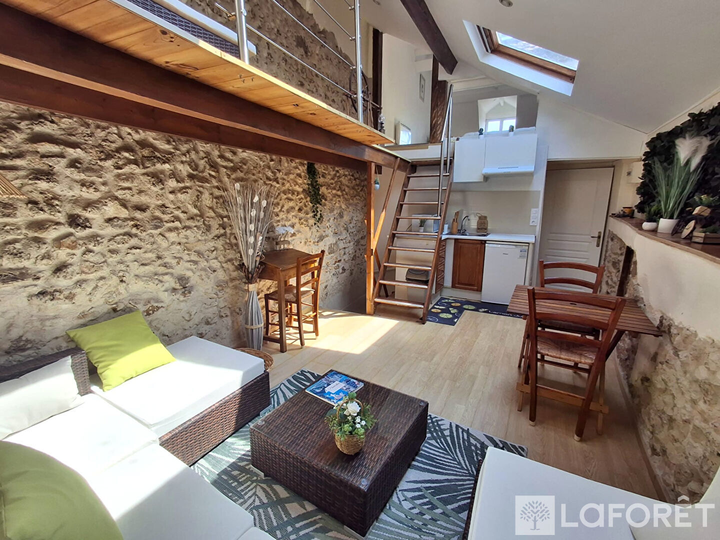 Dès l'entrée, vous découvrirez une agréable pièce de vie, entièrement meublée et équipée, offrant un espace convivial et chaleureux.