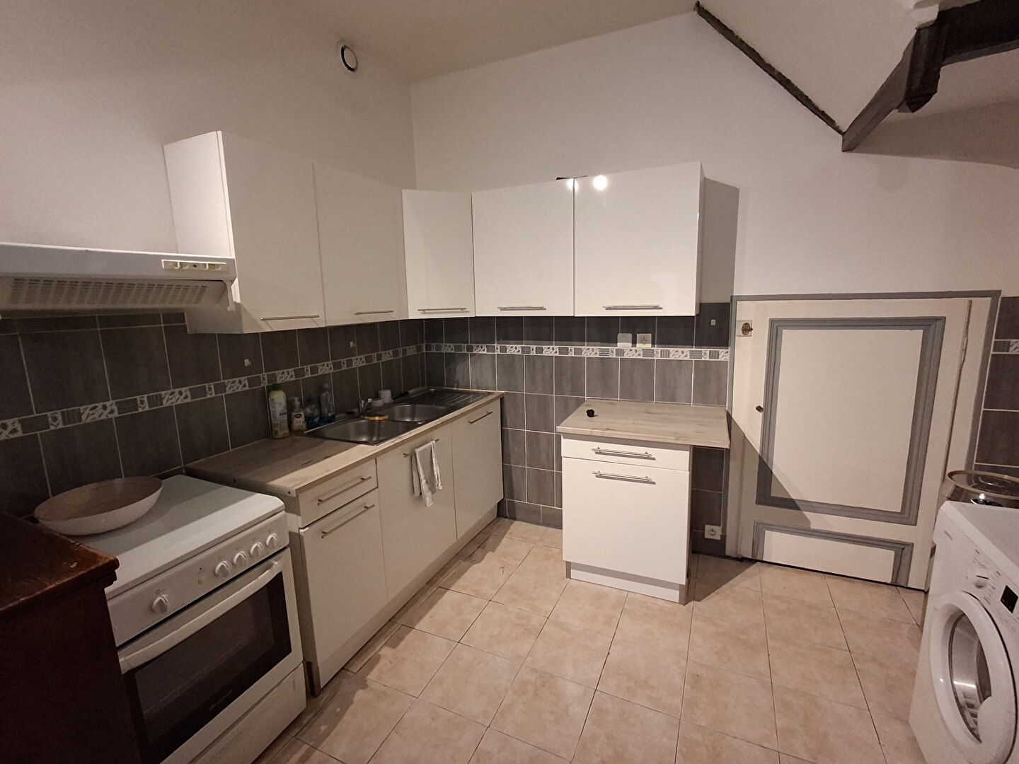 Une cuisine aménagée et équipée, comprenant meubles hauts et bas, plan de travail, évier, hotte et emplacement électroménager permettent d'effectuer des bons plats