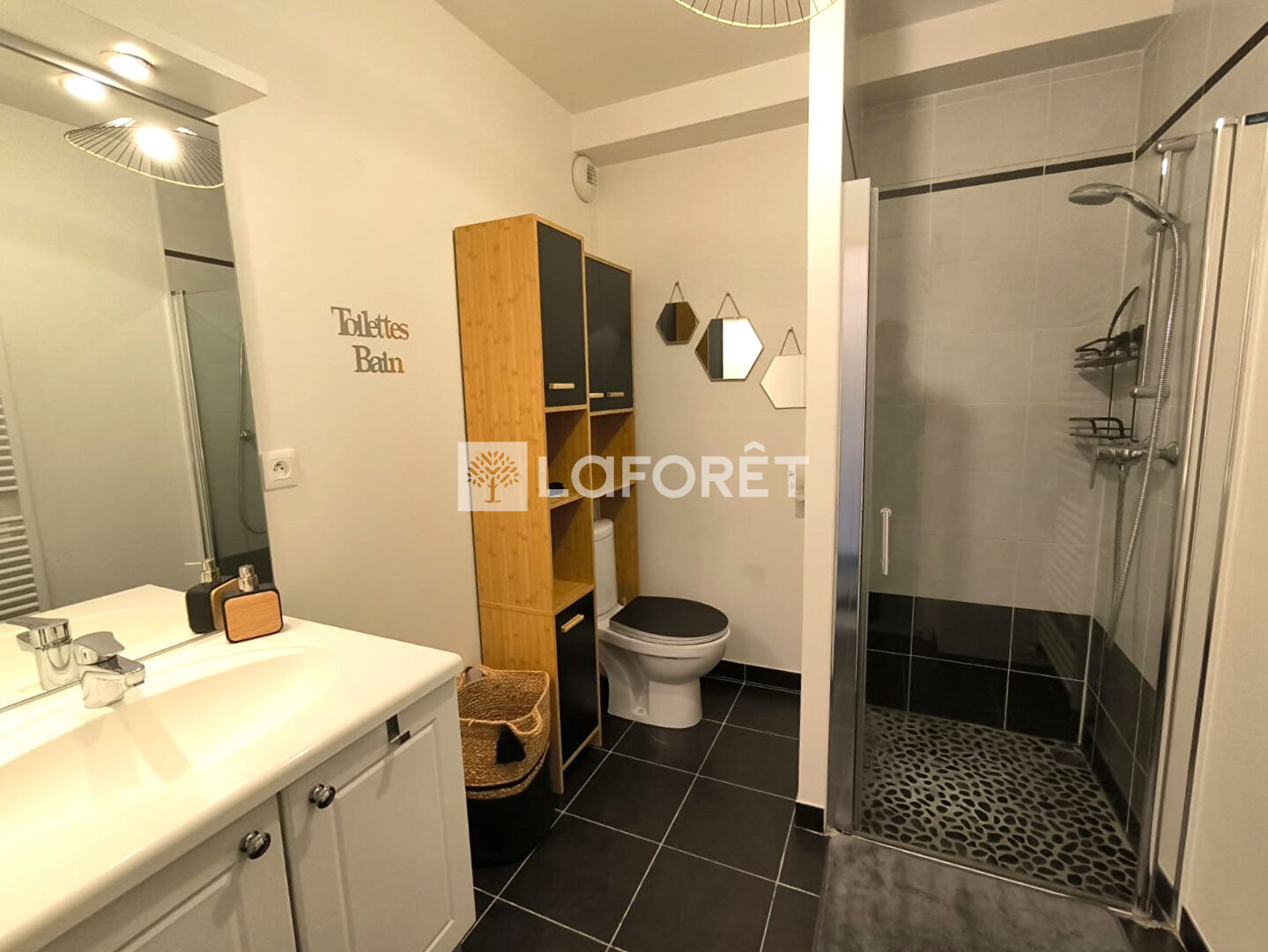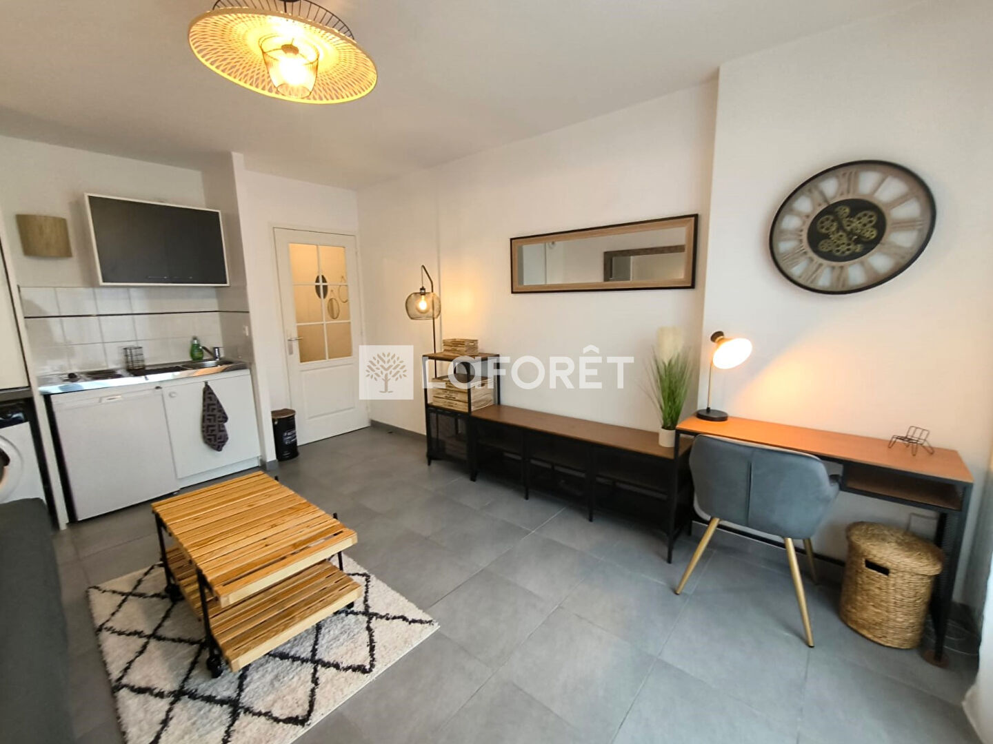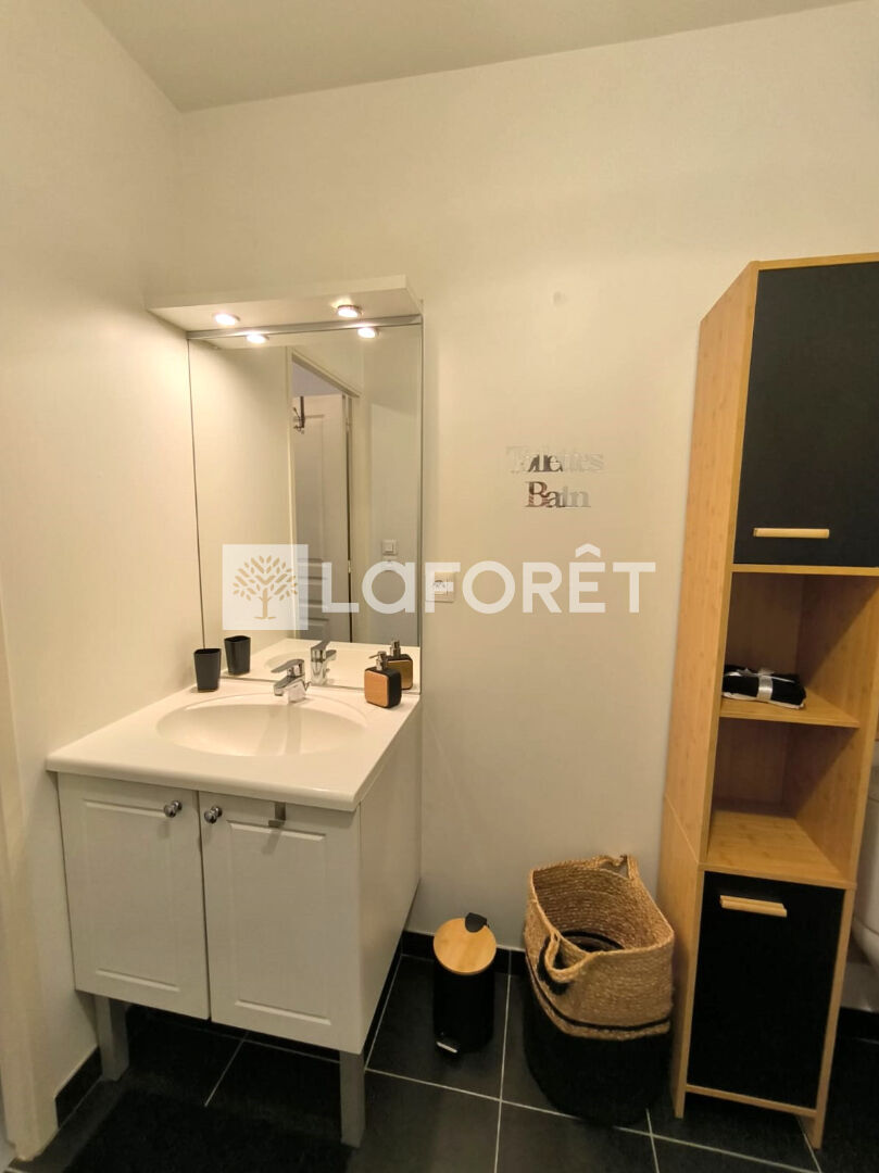 Vous apprécierez l'aménagement et l'équipement de l'appartement : une entrée, une salle de douches avec rangements et WC, pièce de vie avec grande armoire, bureau, kitchenette et machine à laver. Le tout dans une décoration sobre et moderne.