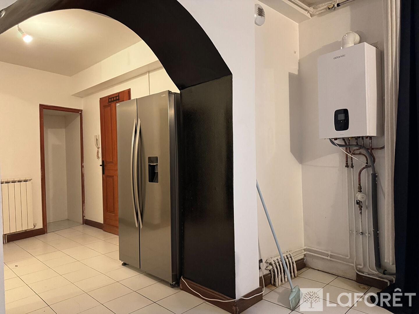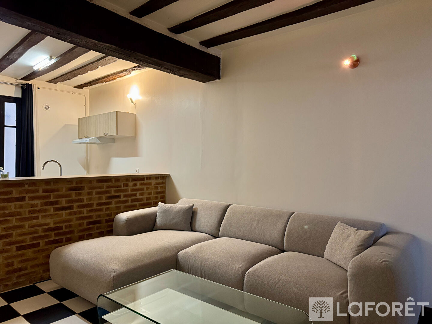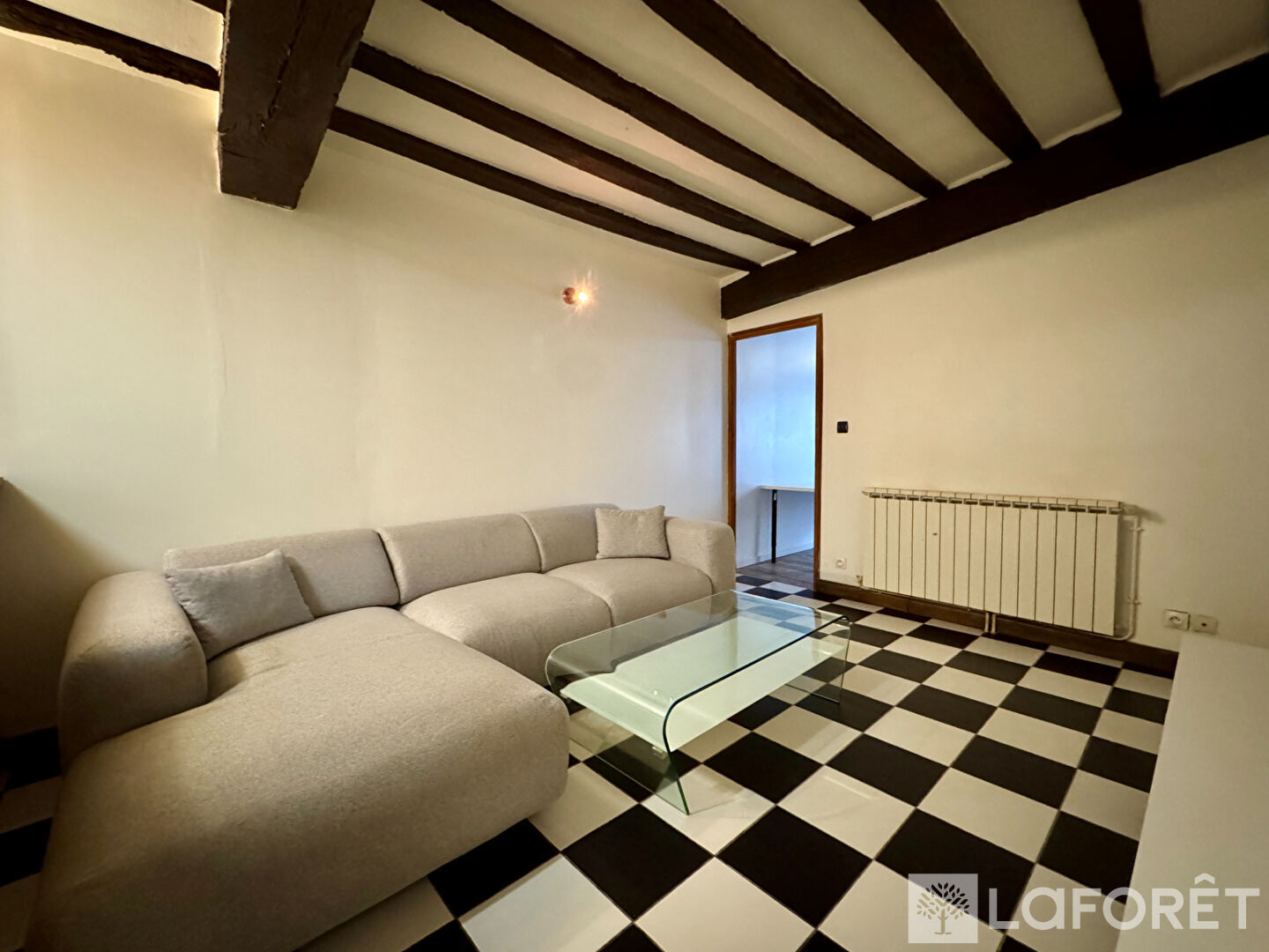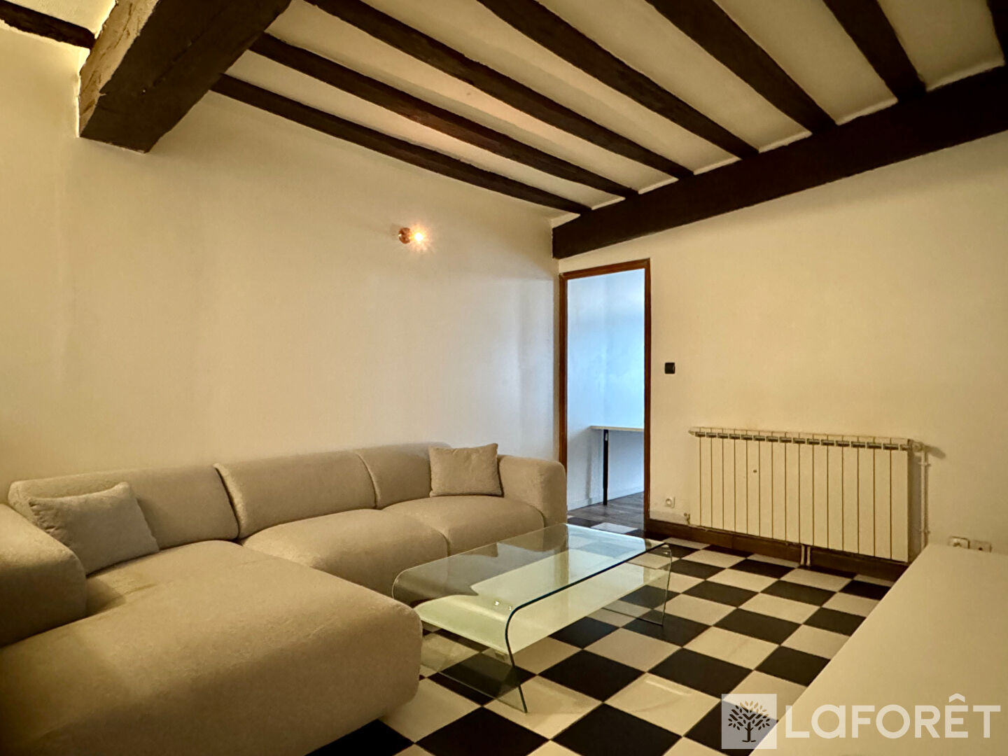 Dès l'entrée, un placard intégré optimise l'espace. La pièce de vie, agrémentée de poutres apparentes, offre une atmosphère chaleureuse et s'ouvre sur une cuisine équipée et aménagée, donnant accès à une agréable petite cour intérieure.