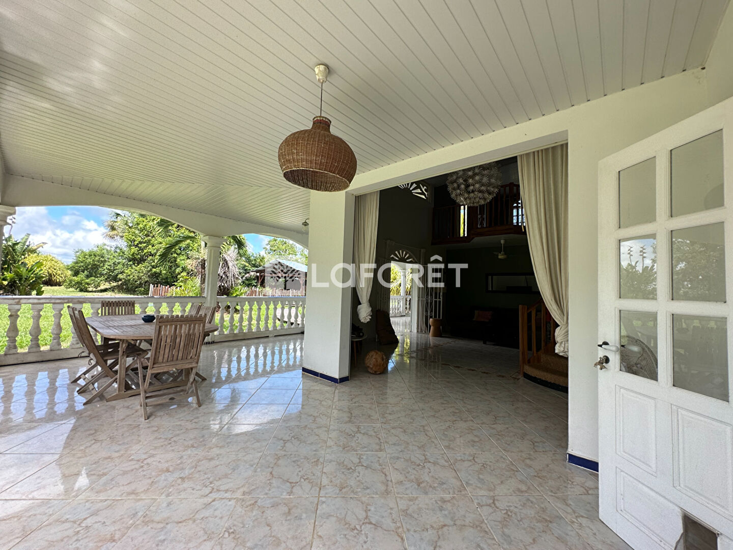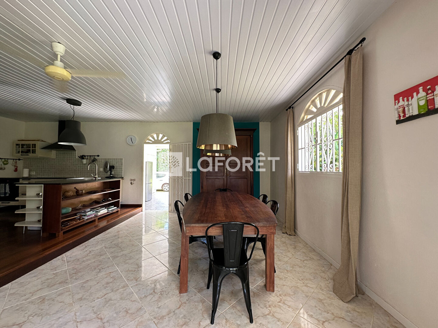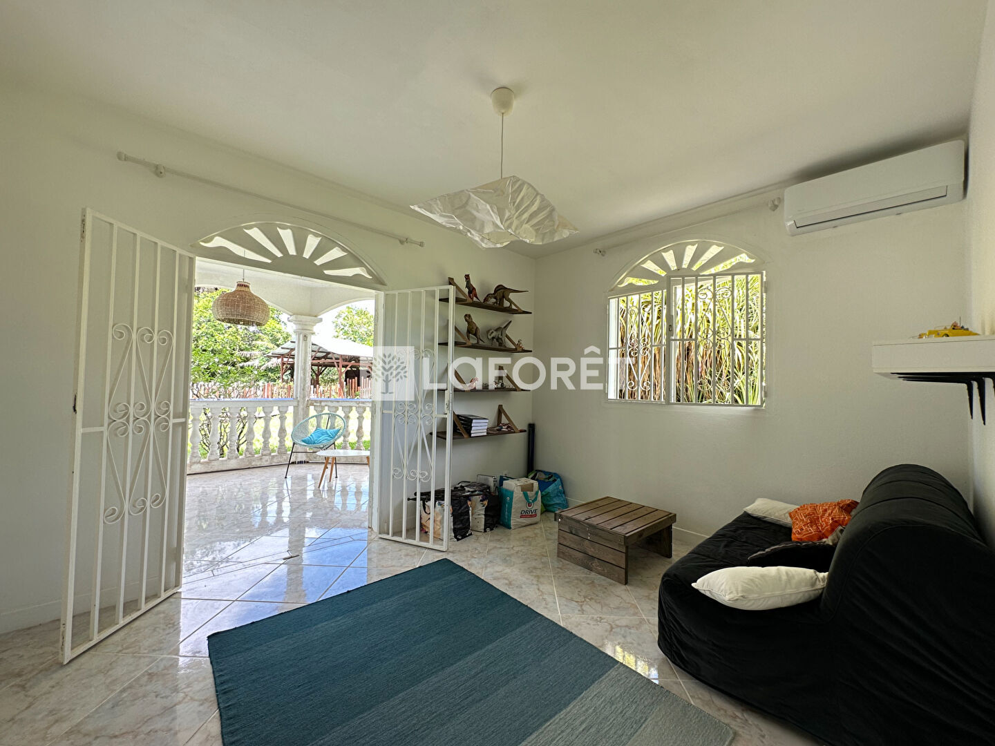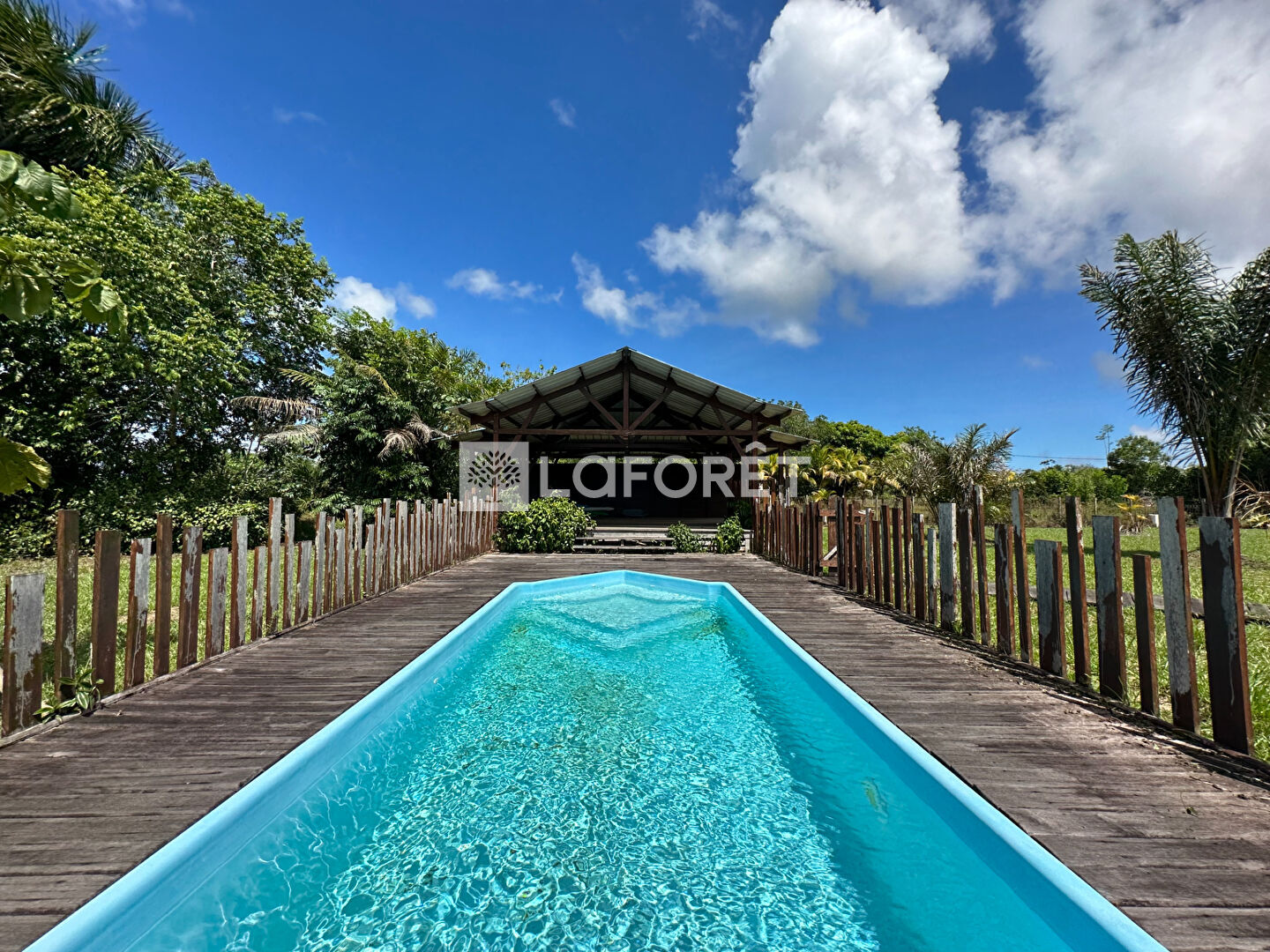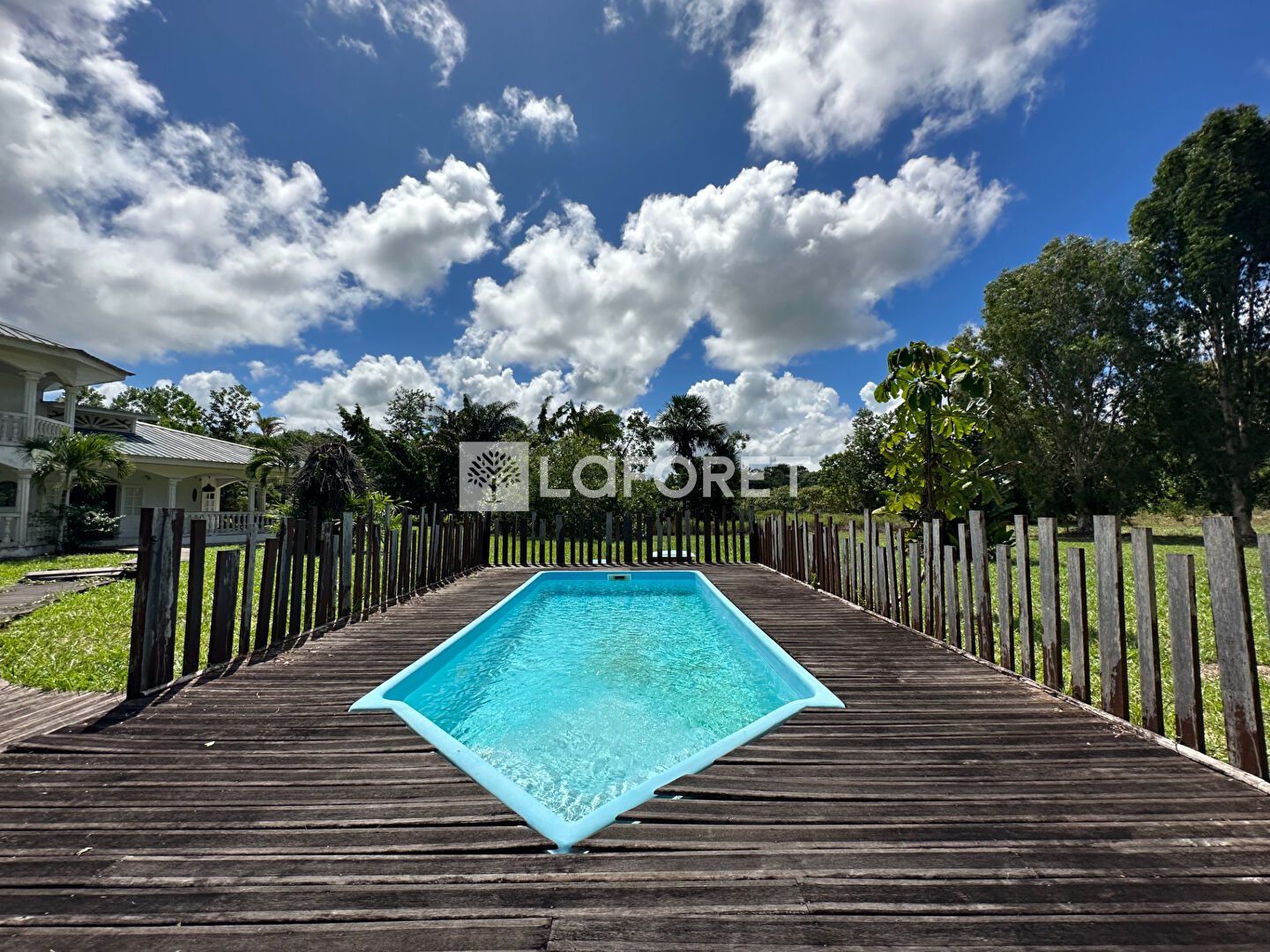 A l'extérieur, une terrasse carrelée et couverte, un abri de voiture, une piscine et un carbet.