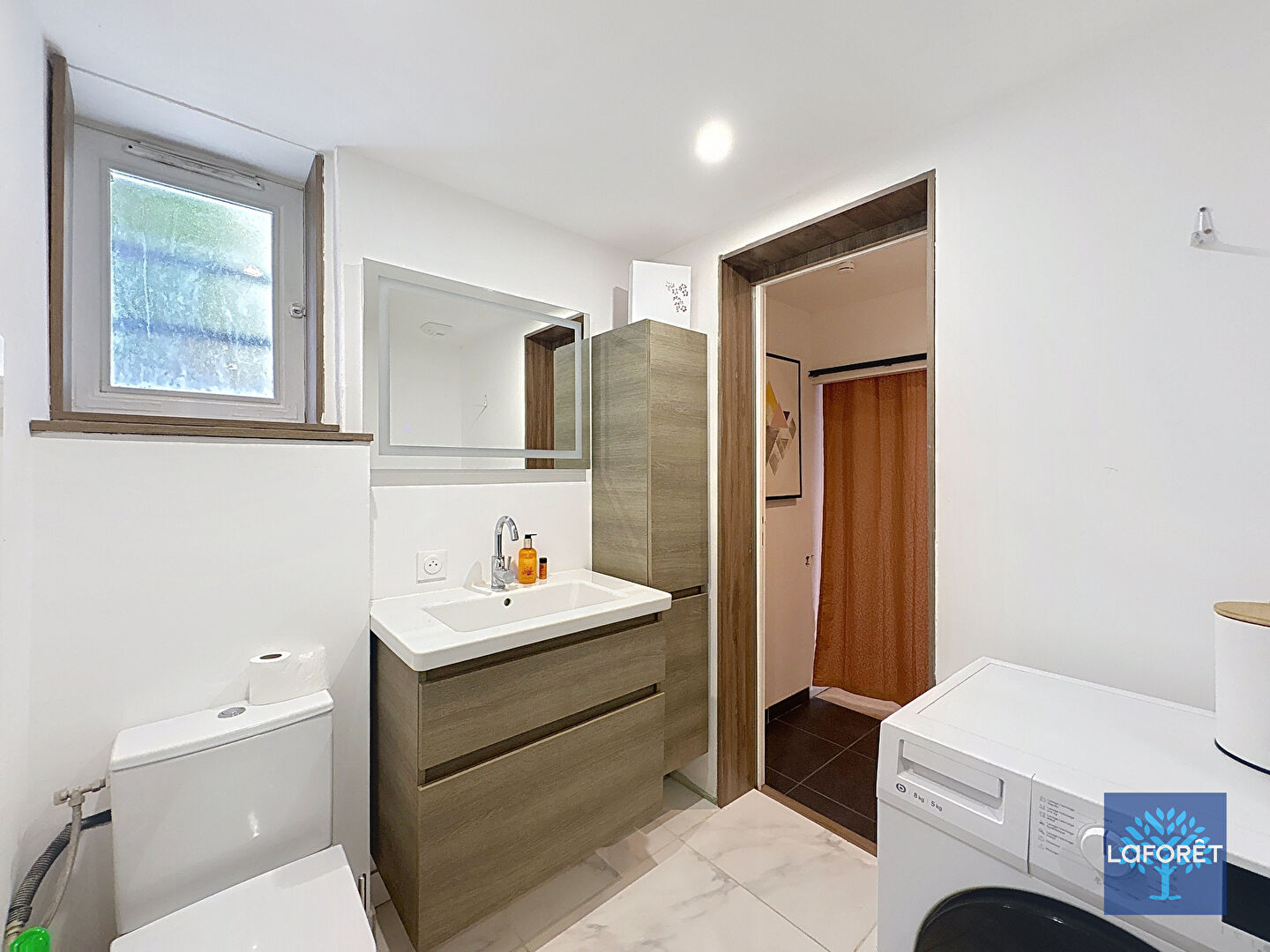 Un débarras de 3.40m², une salle de bain équipée d'une douche ainsi que d'un lave linge et une chambre d'environ 13m².