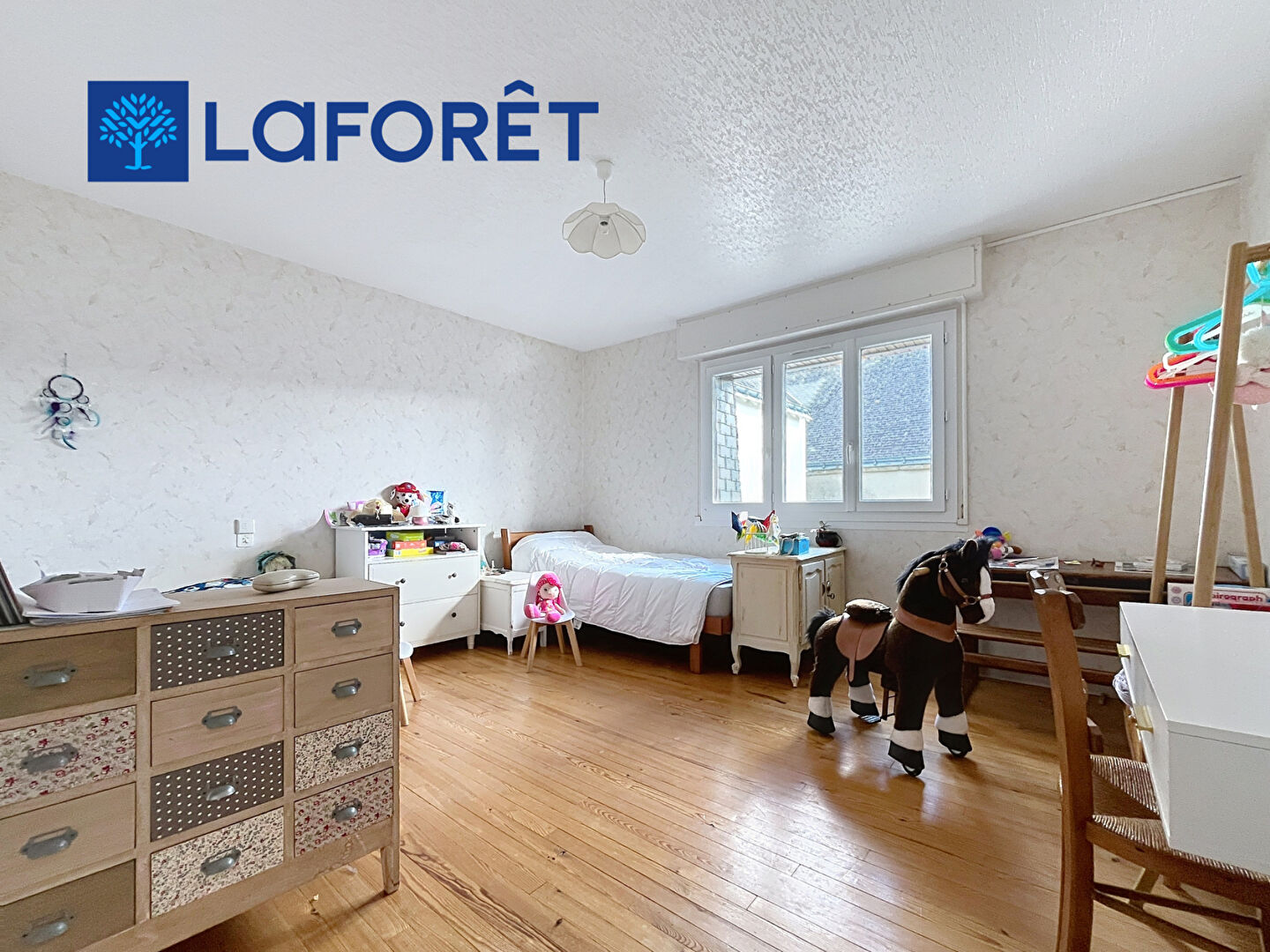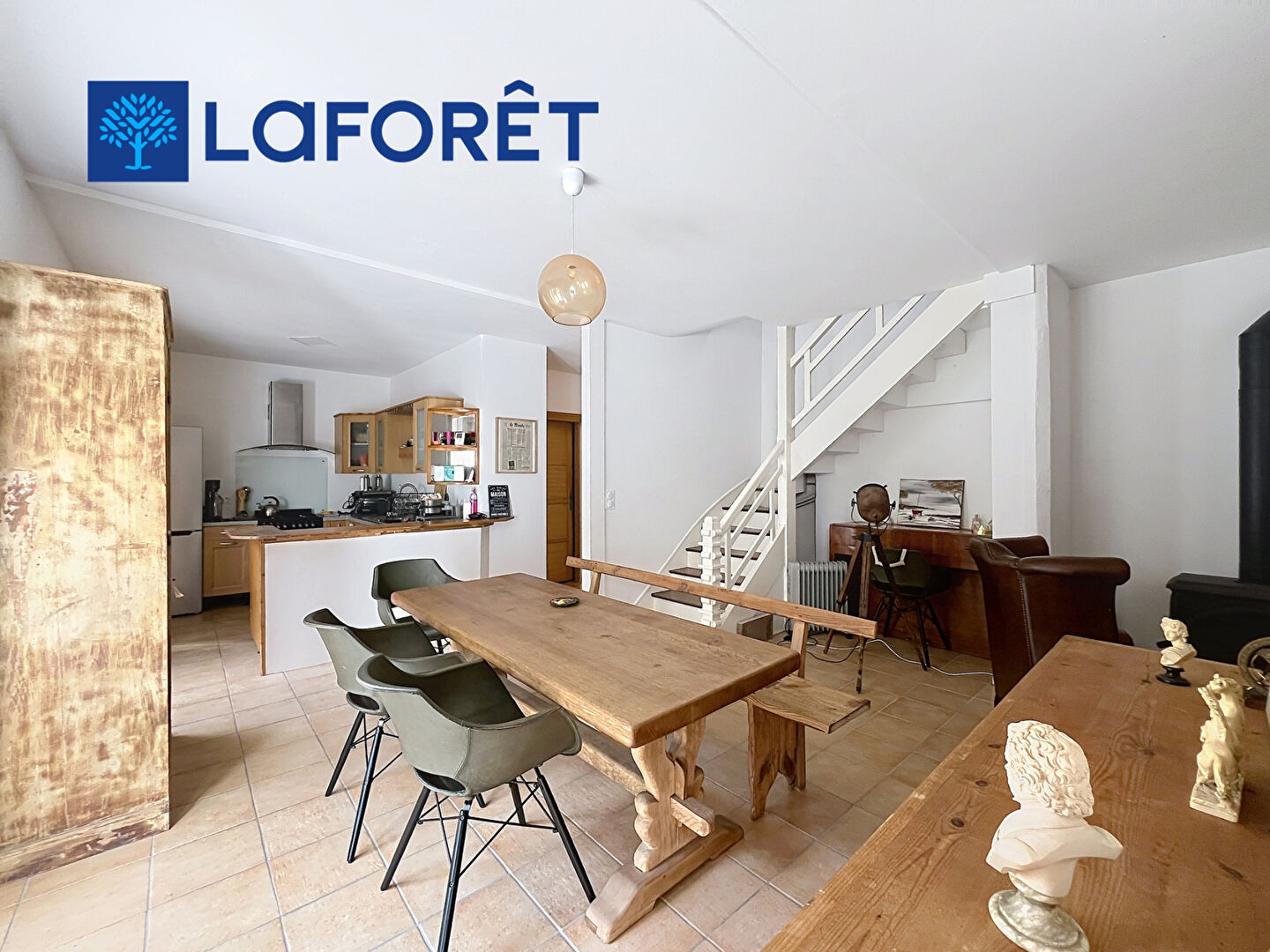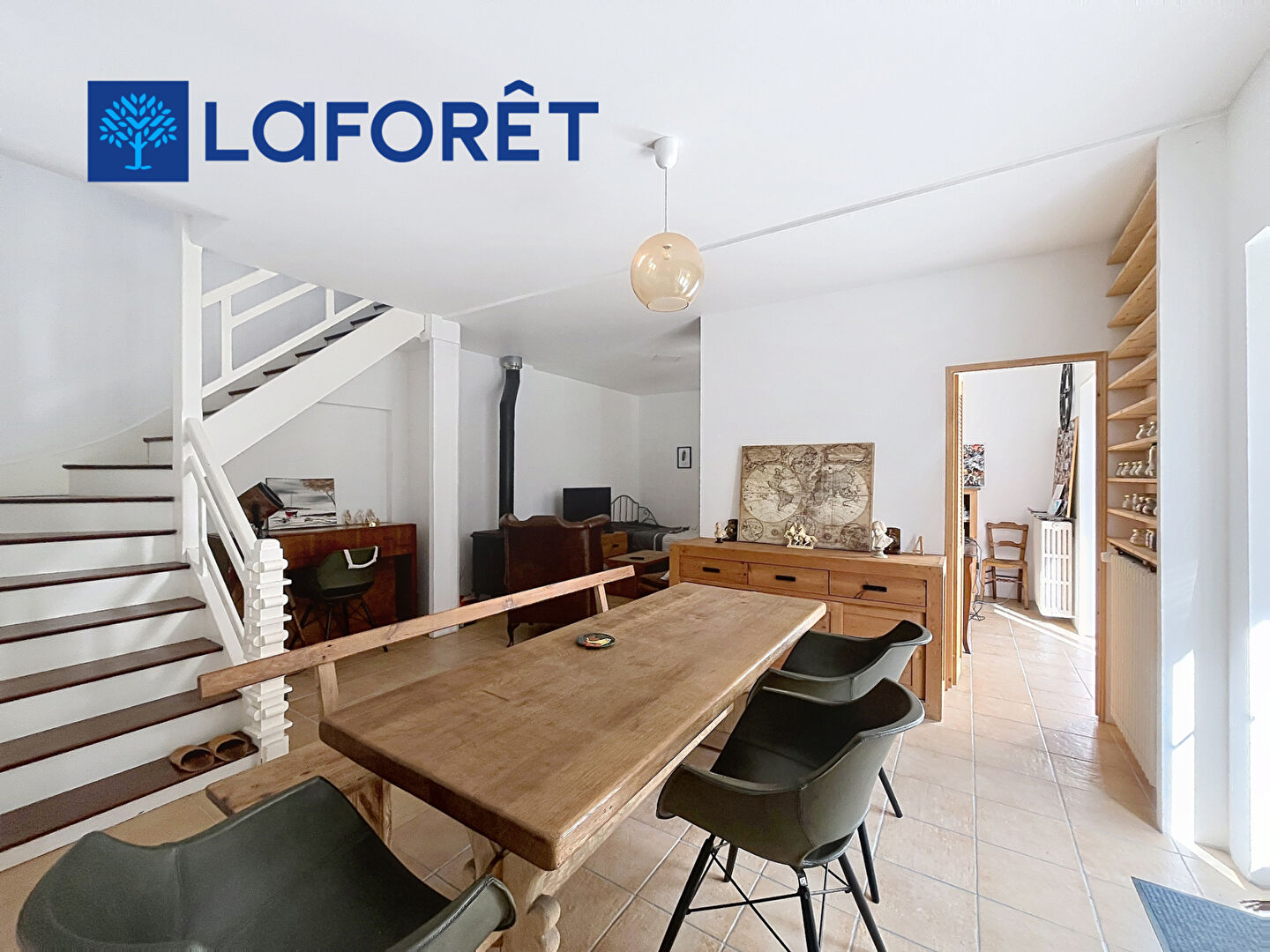 Elle offre de beaux volumes avec trois chambres spacieuses aux parquets massifs, ainsi qu'un bureau idéal pour le télétravail ou une activité complémentaire. La pièce de vie, chaleureuse et conviviale, est agrémentée d'un poêle à bois, parfait pour les soirées cocooning.