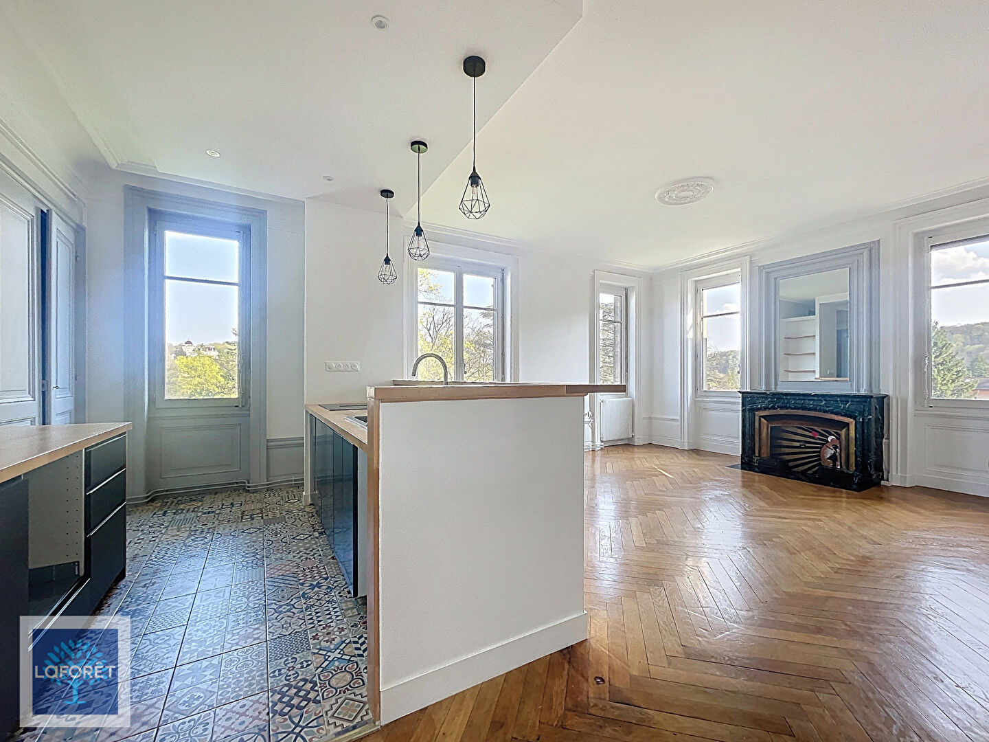 NOUVEAUTÉ - exclusivité LA FORET - Au coeur d'un Château classé - appartement familial en duplex, de 118 m² habitables, 130 m² utiles, situé au 2ème étage, sans ascenseur d'une toute petite copropriété de 5 lots. Cette propriété datant de 1903 vous propose un bien entièrement rénové dans le charme de l'ancien (parquet, moulures, cheminées, volumes généreux...). Il se compose au rez de chaussée de : hall d'entrée avec rangement et WC indépendant, salle d'eau, chambre, dégagement, cuisines aménagée ouverte sur séjour salle à manger. Au 1er étage : palier desservant 3 chambres avec rangements, salle de bains familiale, WC indépendant. Un stationnement extérieur complète le bien. Jouissance communes et agréable du parc, fermé et sécurisé.