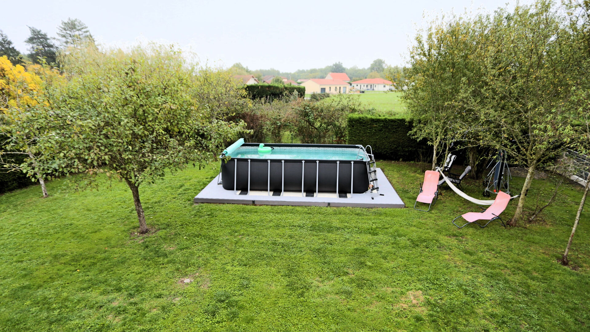 Le jardin clos et arboré accueille une piscine hors sol, idéale pour profiter des beaux jours.