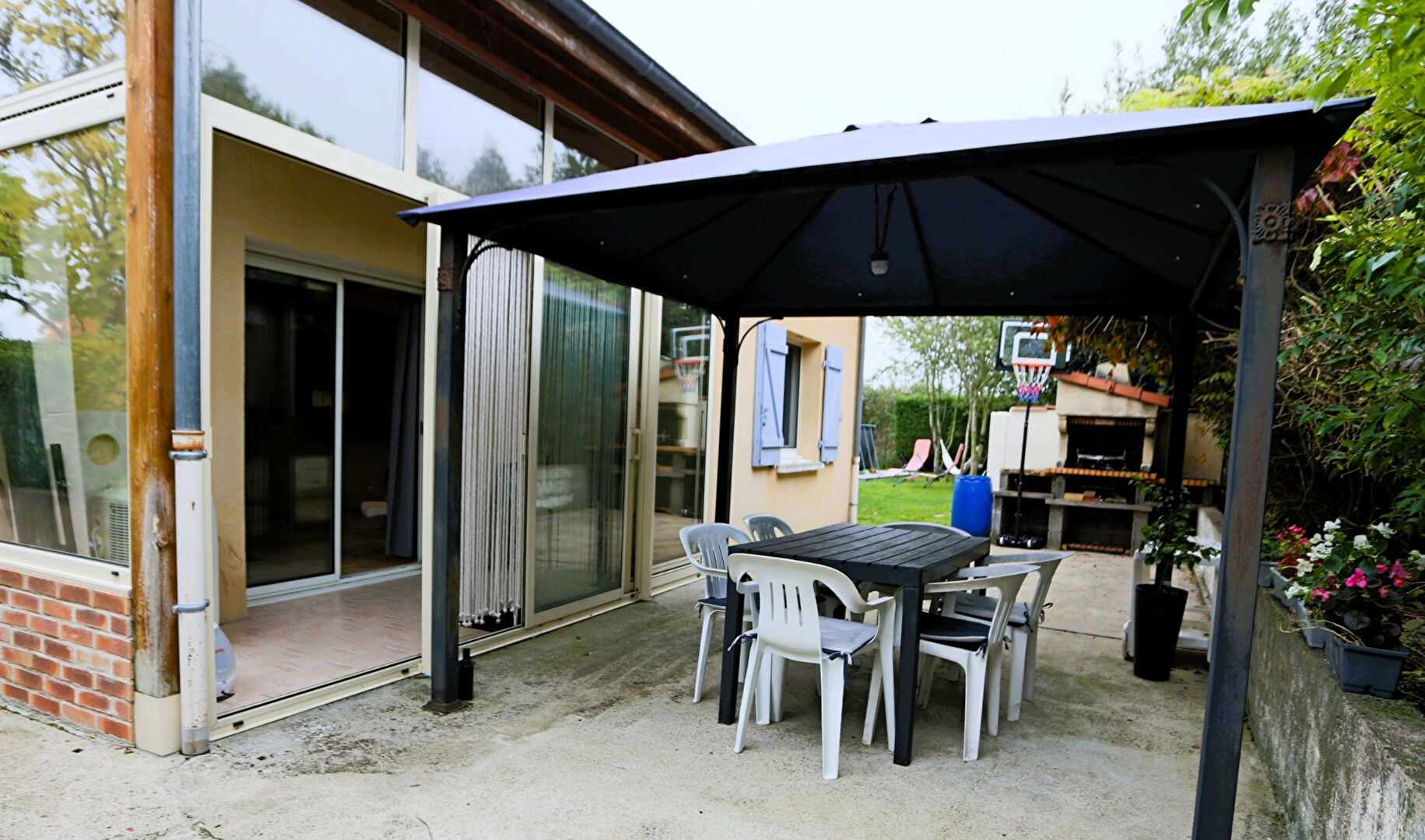 Au rez-de-chaussée, vous découvrirez une spacieuse pièce de vie avec cheminée double foyer, ouverte sur une cuisine aménagée et conviviale. Cet espace donne accès à une véranda lumineuse ouvrant directement sur la terrasse.