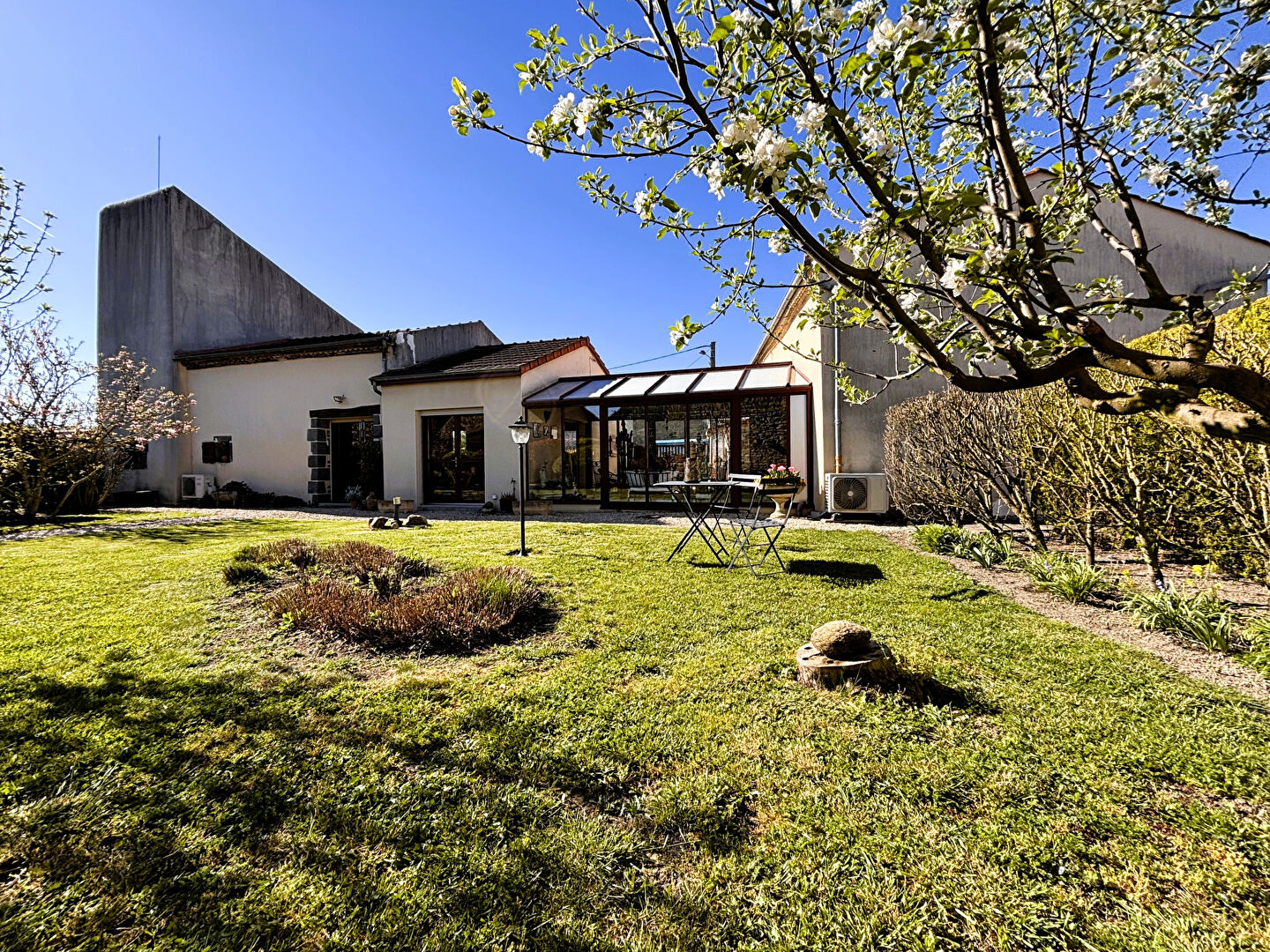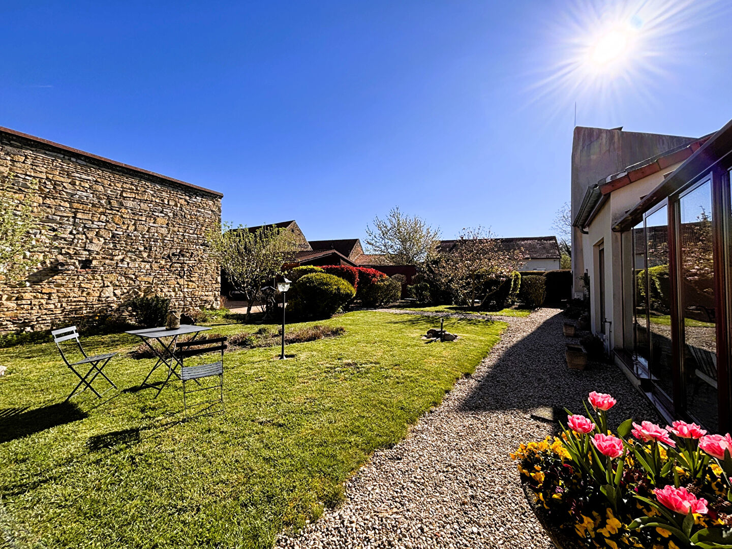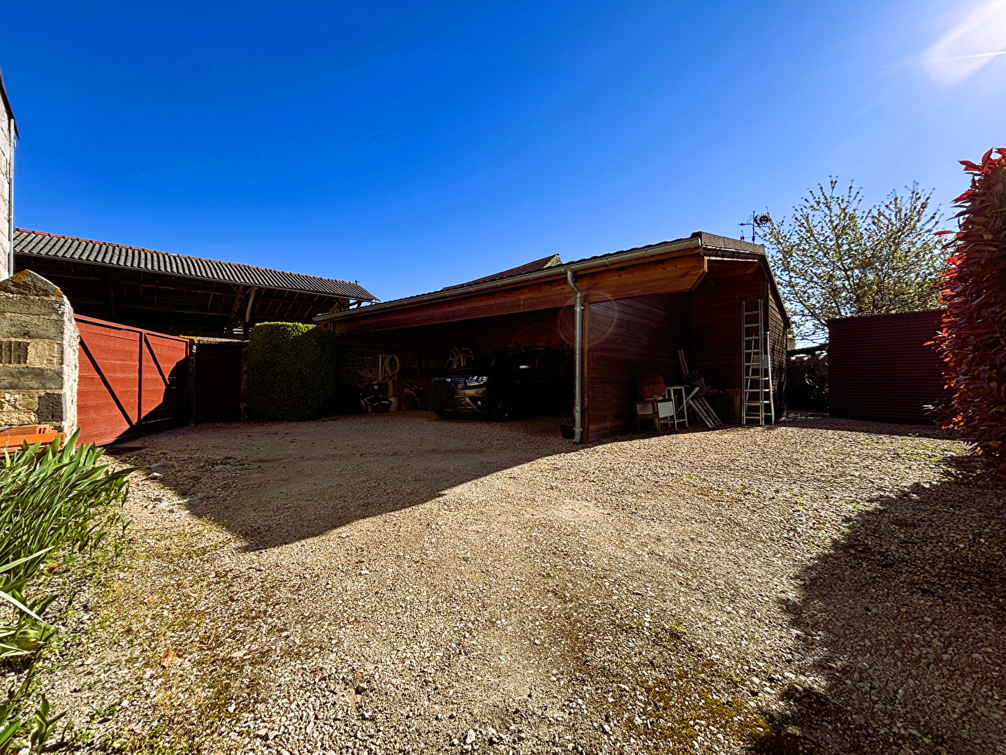 À l'extérieur, le terrain clos et arboré, sans aucun vis-à-vis, constitue un véritable havre de paix, idéal pour profiter pleinement des beaux jours en toute tranquillité.