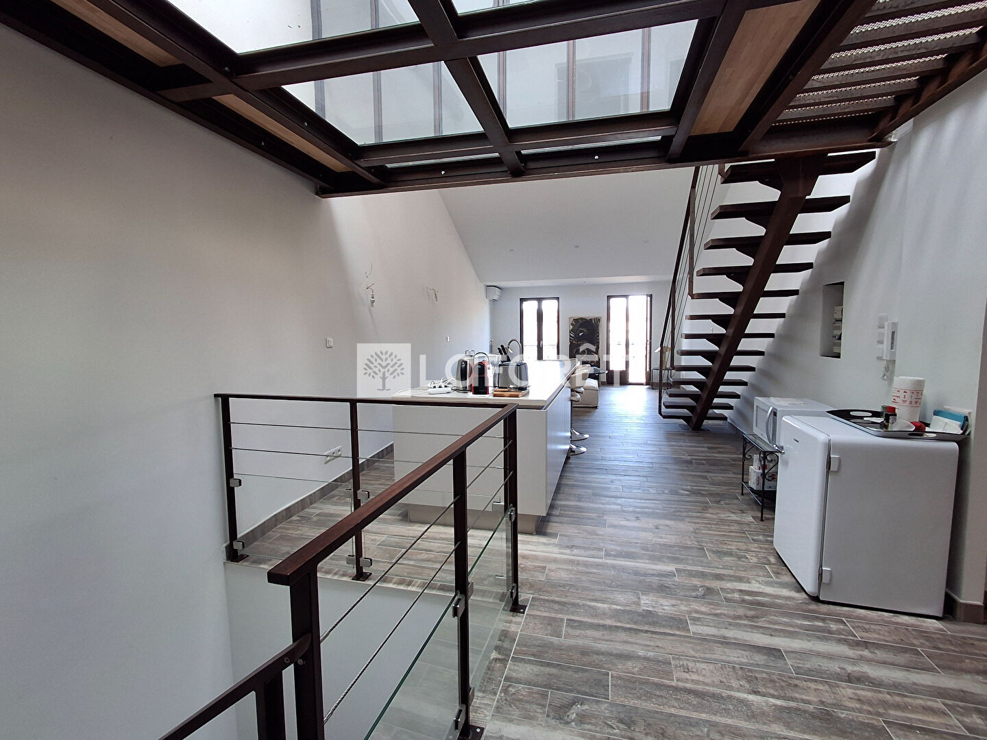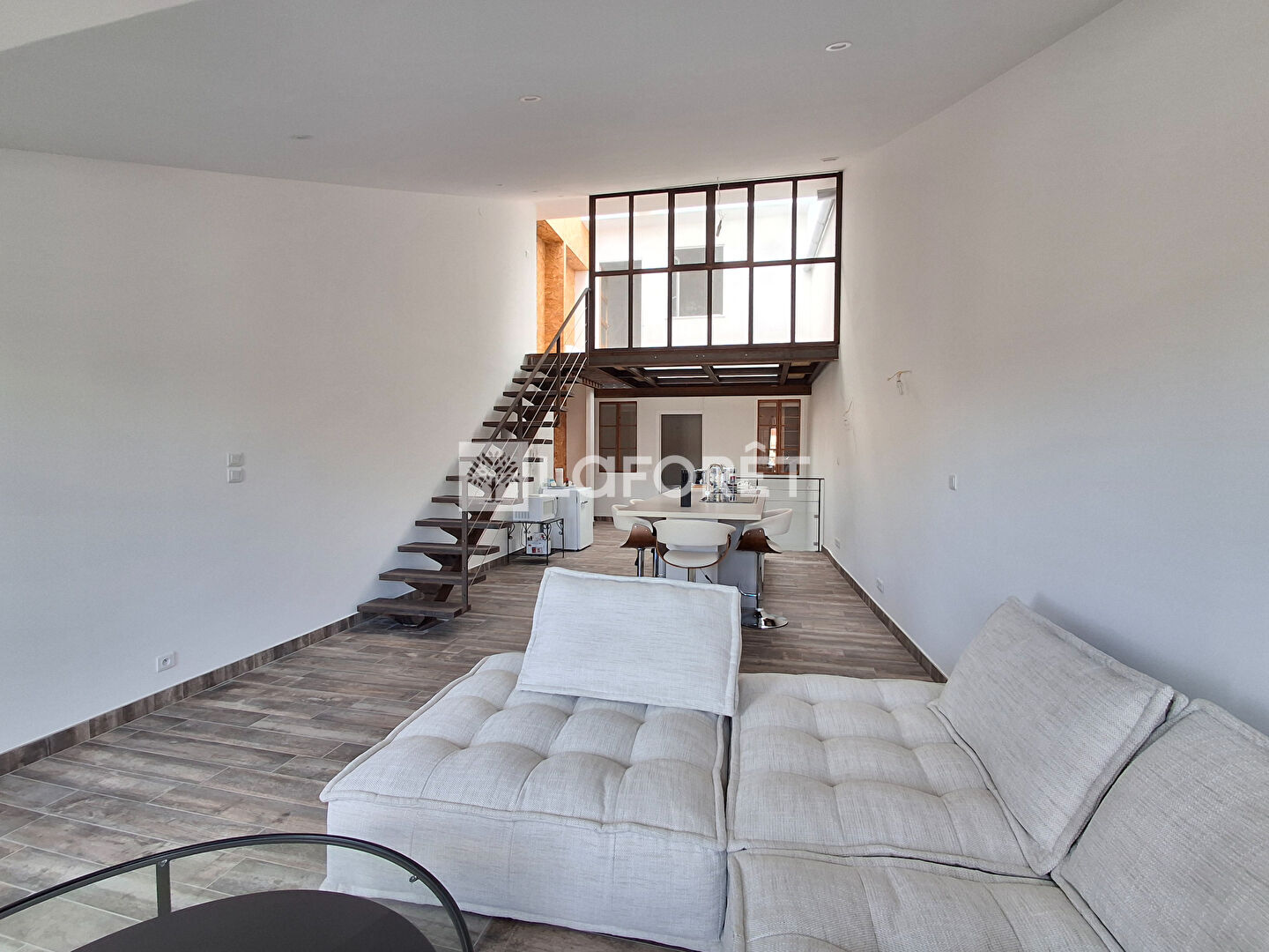 Belle pièce de vie spacieuse avec grande hauteur sous plafond, 2 chambres avec chacune une salle d'eau et un wc, une mezzanine avec verrière style atelier, un escalier design et des finitions modernes.