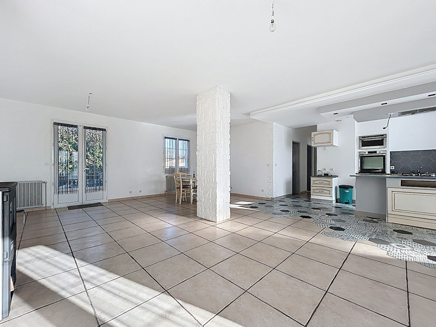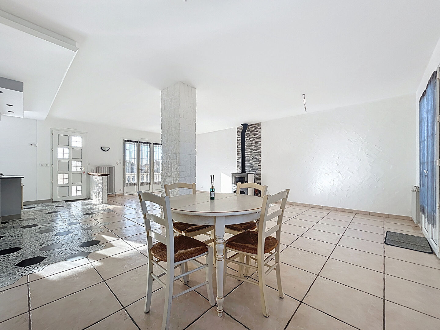 Cuisine ouverte sur une belle pièce de vie d'environ 54 m² avec poêle à bois