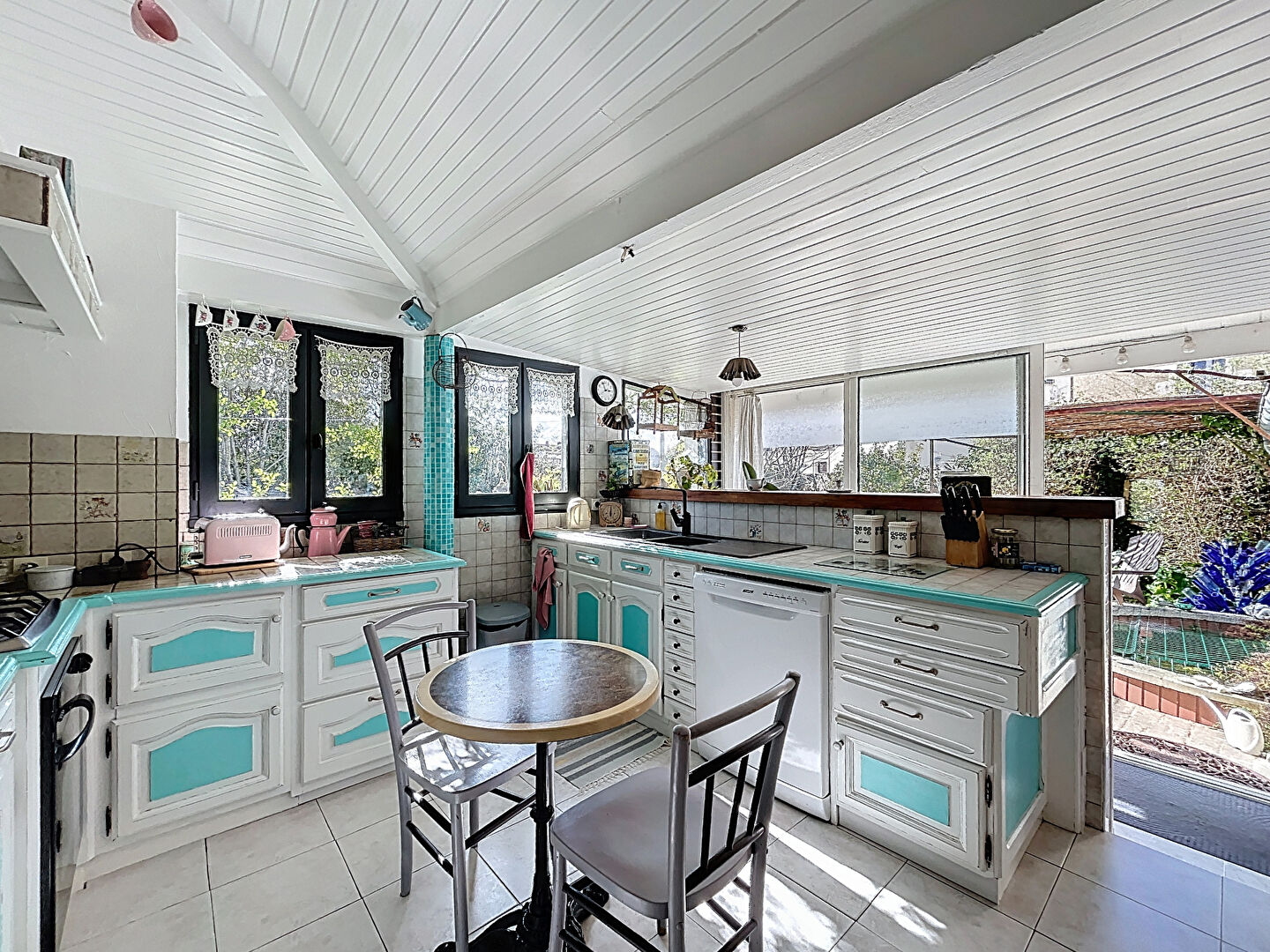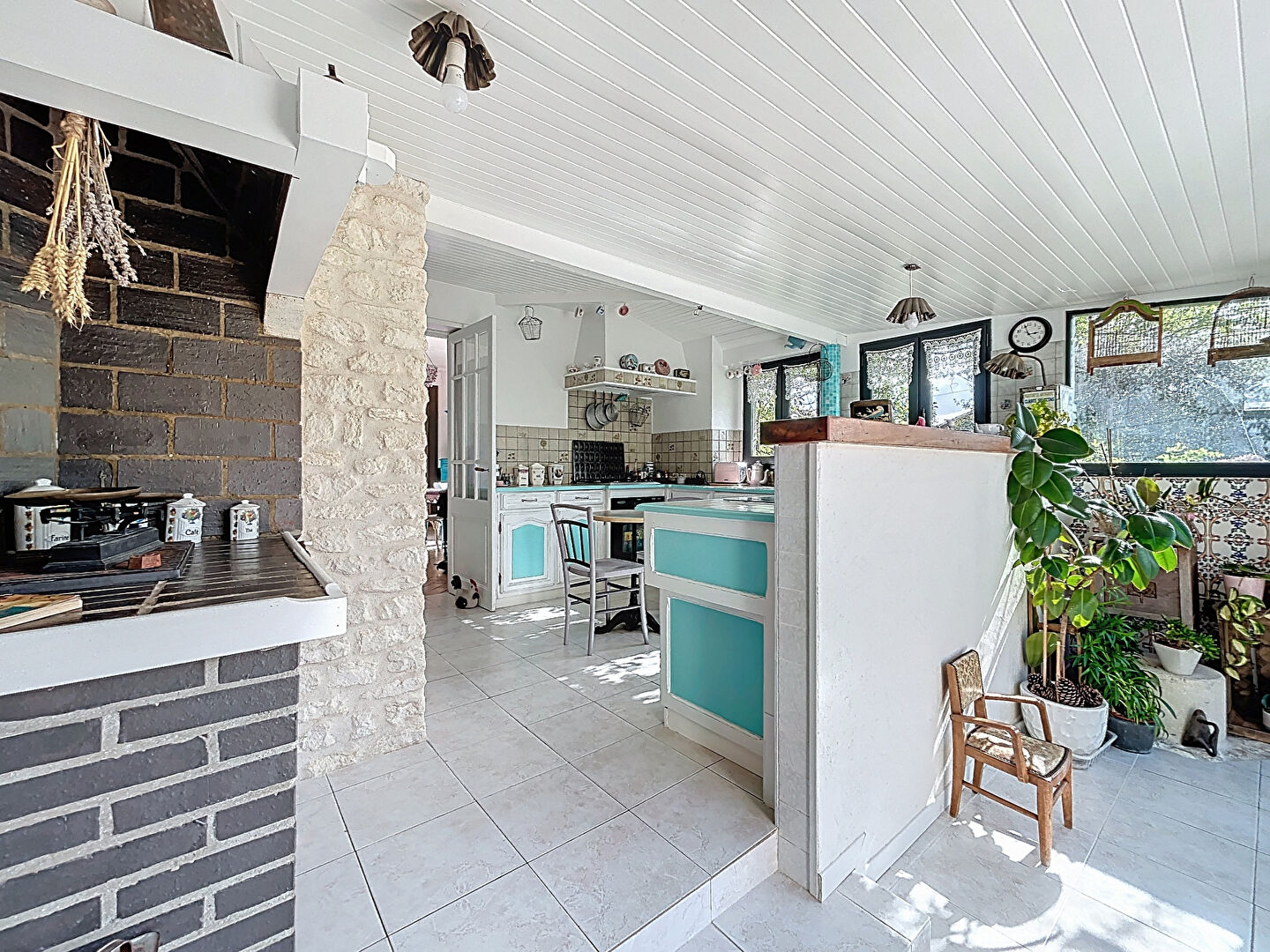 Elle comprend une cuisine ouverte donnant sur la terrasse, un double salon/séjour avec poêle à bois, 3 chambres avec placards, une salle d'eau/salle de bains et une buanderie.