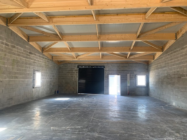 Local équipé de portes sectionnelles électriques, sol en quartz, stationnements privatifs, 5 m sous faitage et possibilité d'aménager un galetas.