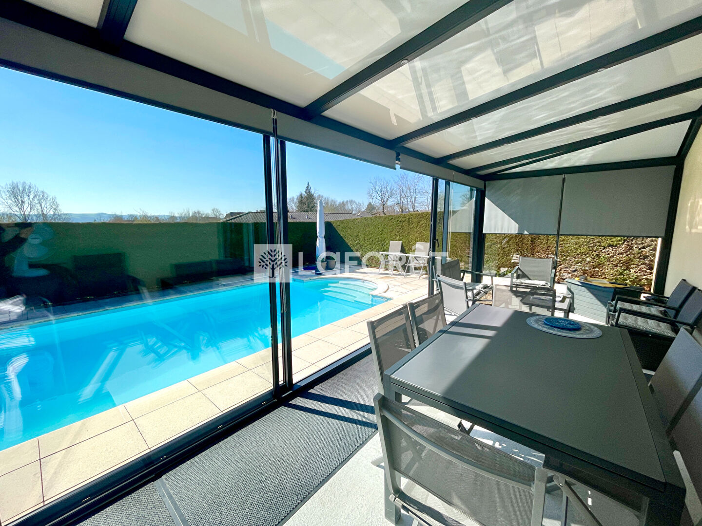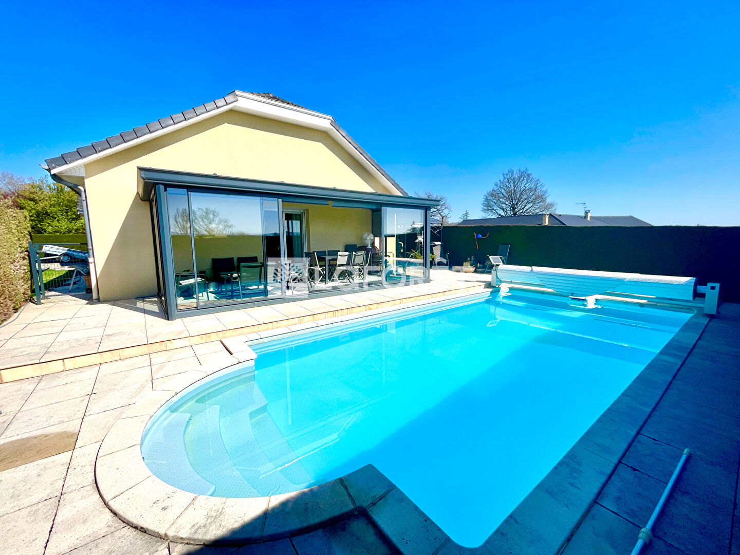 Elle se compose d'une belle pièce de vie, de trois chambres, d'une splendide véranda donnant sur la piscine, d'un garage, d'une généreuse cuisine d'été...