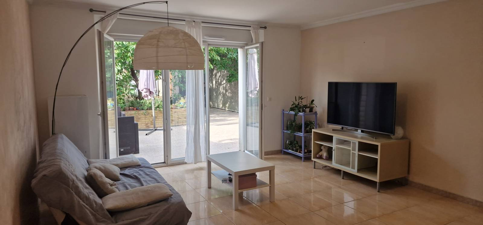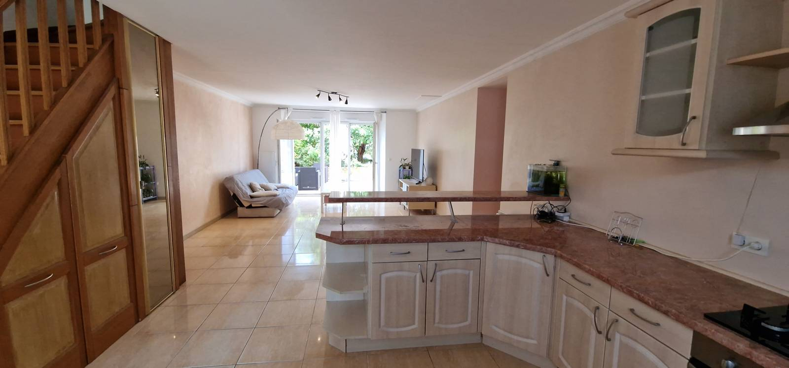 Un vaste salon-séjour avec cuisine américaine de 43 m², baigné de lumière grâce à son exposition plein sud et son accès direct à la terrasse et au jardin