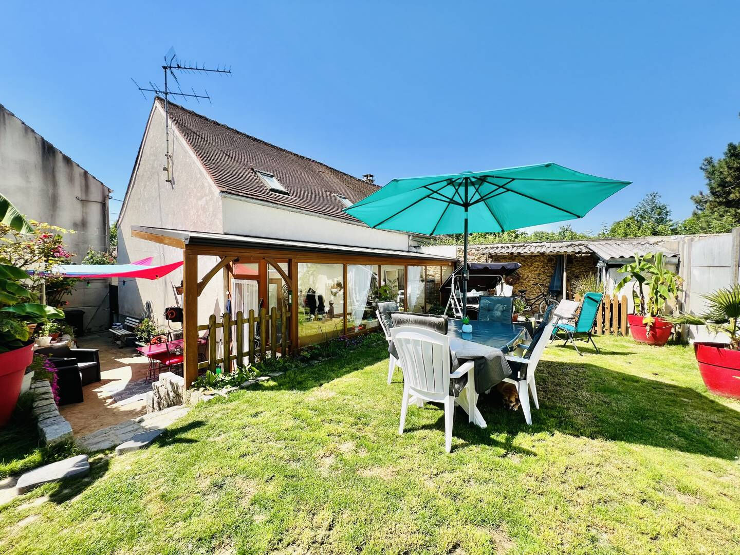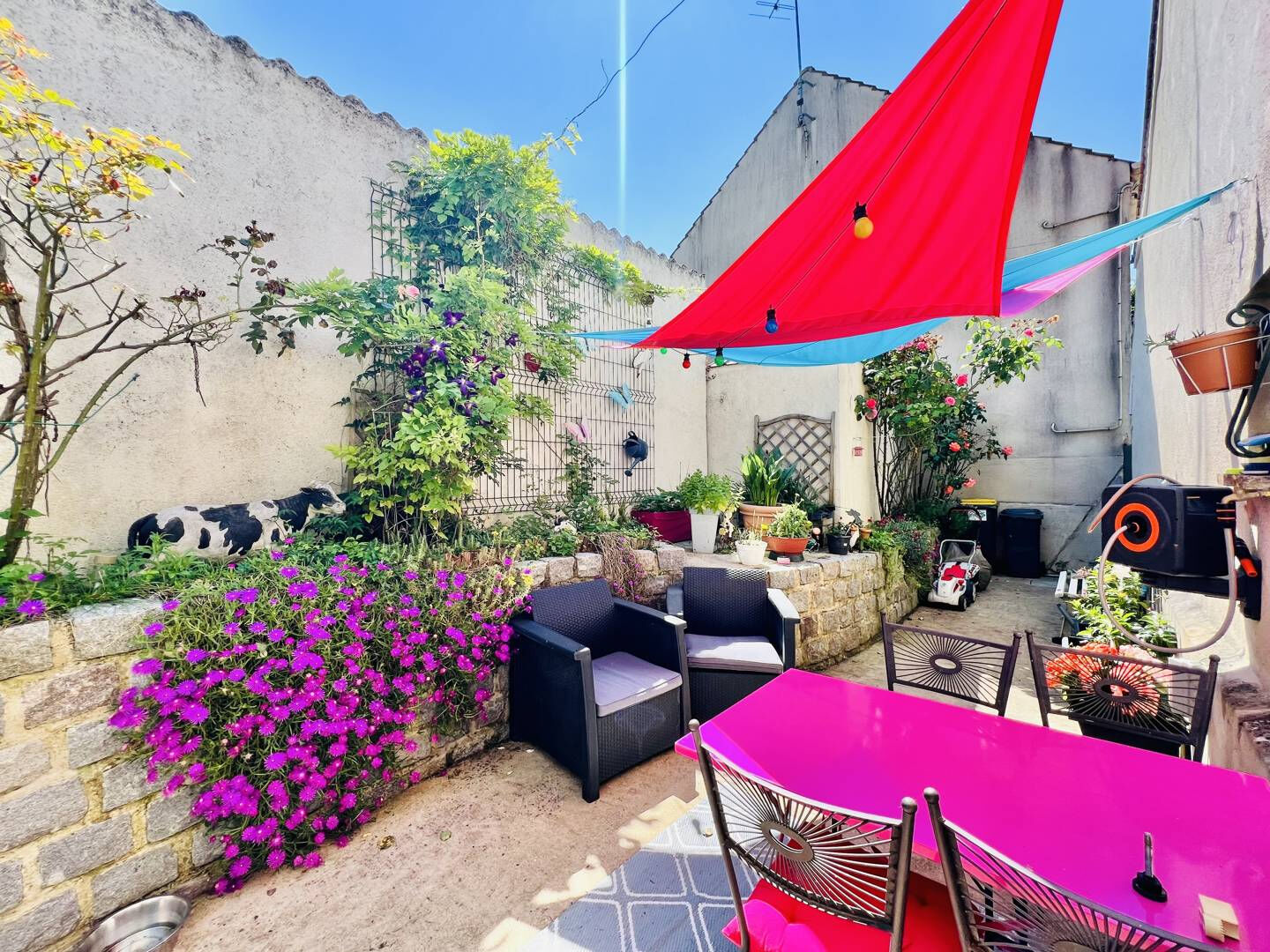 Lequel comprend une allée fleurie pleine de charme favorisant les instants de détente et de convivialité, un beau jardin avec plusieurs espaces de stockages, un garage