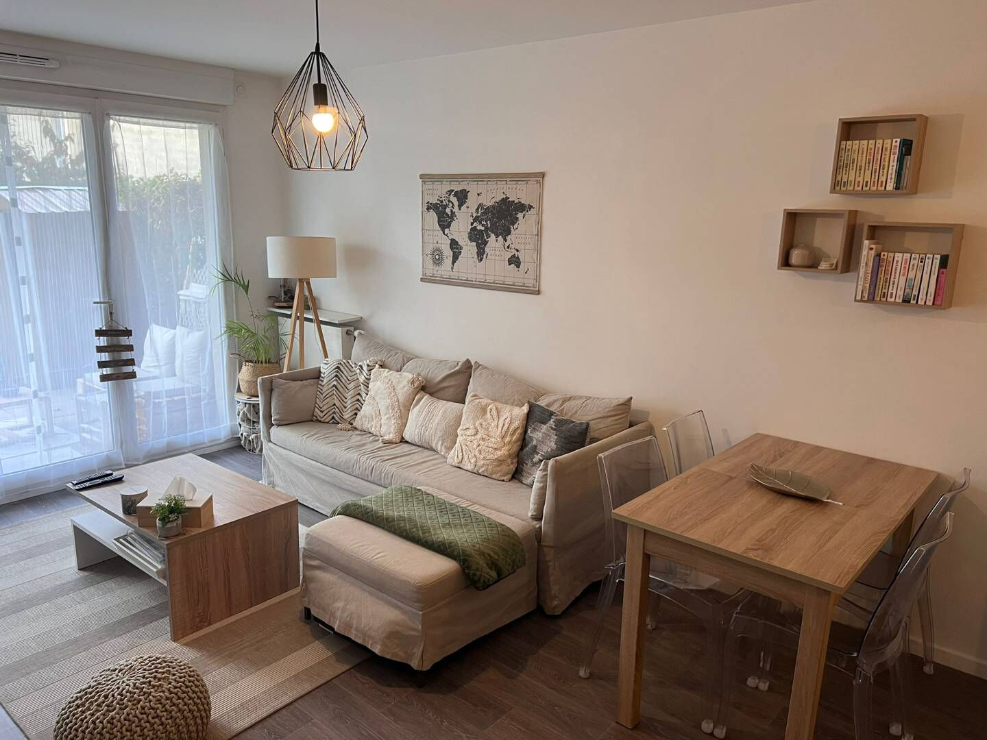 Il comprend une pièce de vie avec cuisine aménagée et salon donnant sur terrasse et jardin, une chambre, et une grande salle d'eau avec wc.