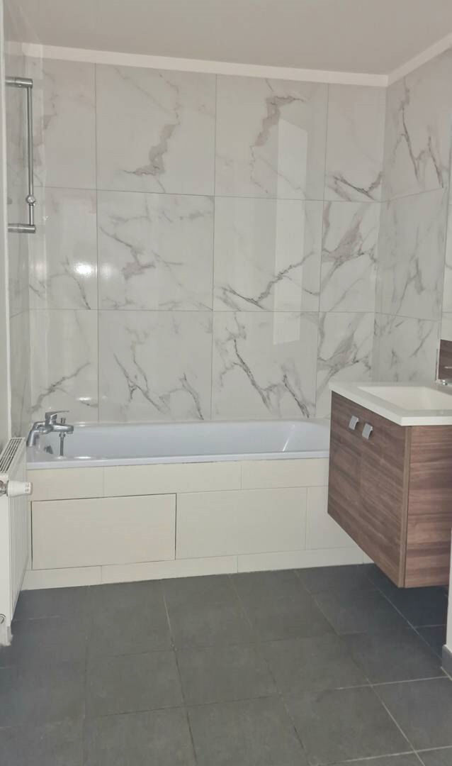 Salle de bains contemporaine, entièrement carrelée (sol et murs) avec WC