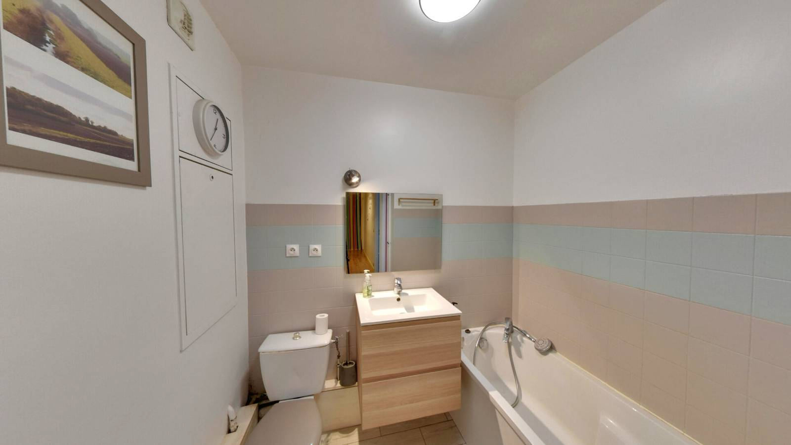 Il se compose d'une vaste entrée avec WC indépendant, d'une cuisine aménagée et équipée ouverte sur un séjour / salle à manger lumineux donnant accès à un balcon, ainsi que d'un espace bureau avec rangements sous l'escalier.