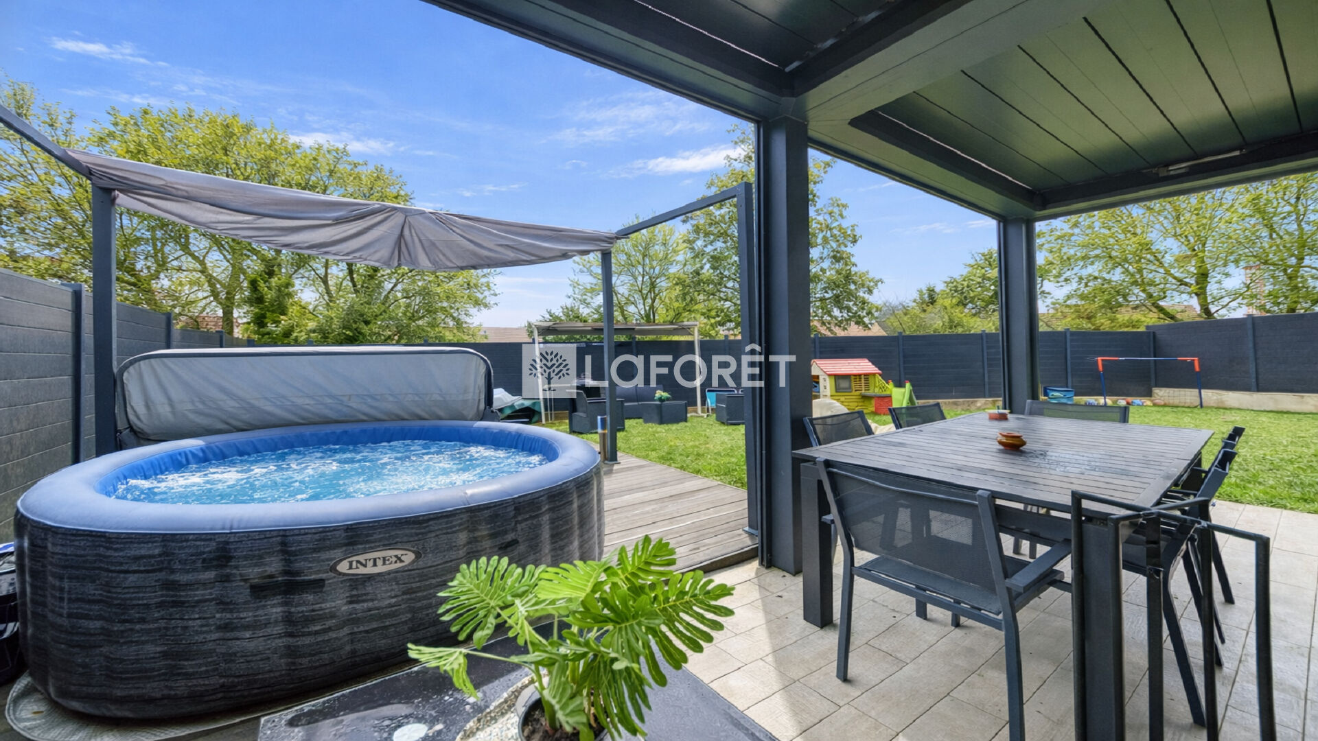 Elle est édifiée sur un beau terrain de 379 m² exposé ouest et sans aucun vis-à-vis dans lequel vous pourrez profiter d'un espace détente agrémenté d'une piscine et d'un jacuzzi, ainsi que d'un garage indépendant et de deux places de parking.
