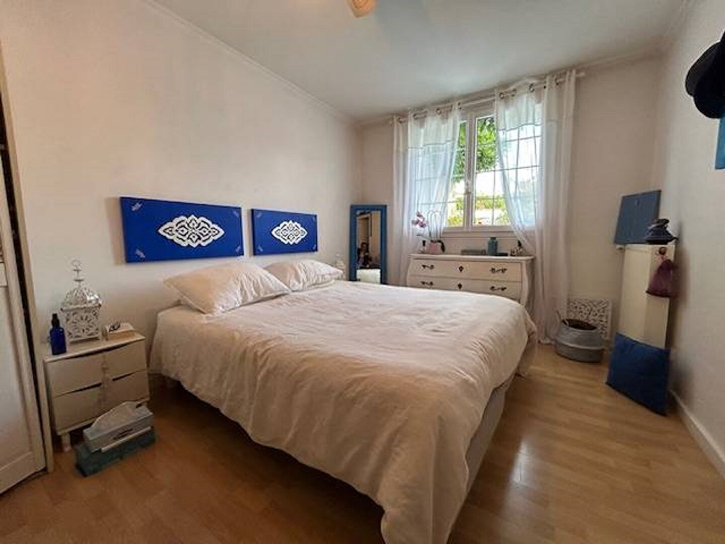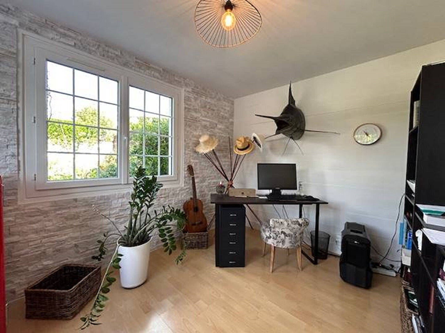 Entrée, séjour triple avec coin bureau d'environ 55 m² avec cheminée insert très lumineux, cuisine aménagée et équipée, WC, salle d'eau avec douche à l'italienne, trois chambres dont une avec dressing.
