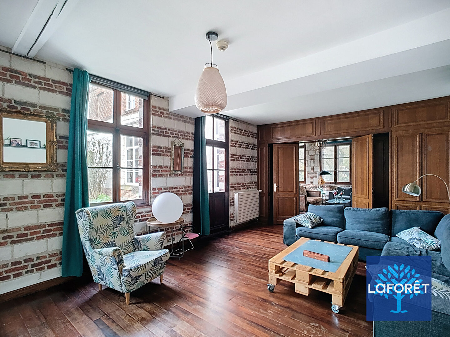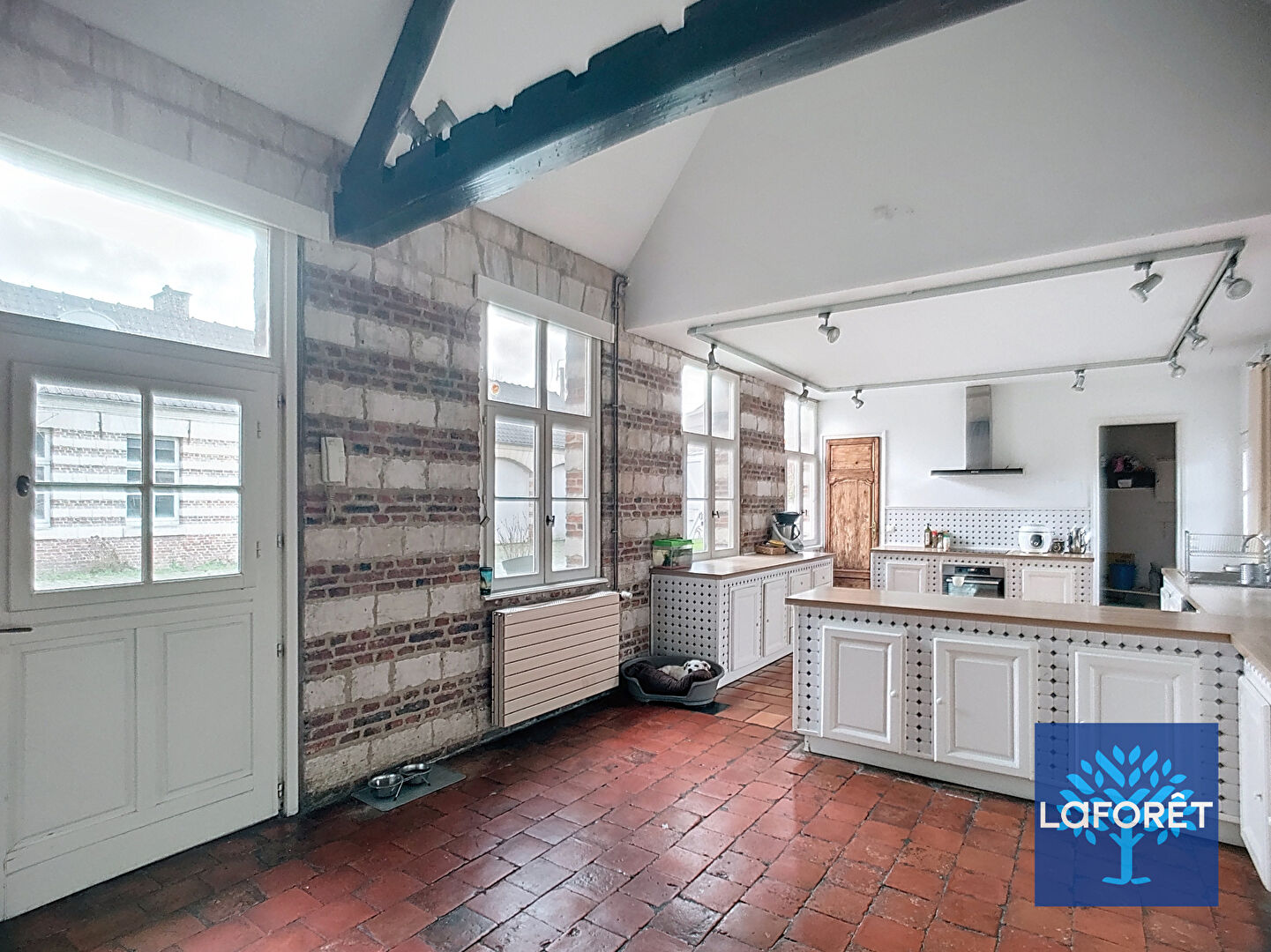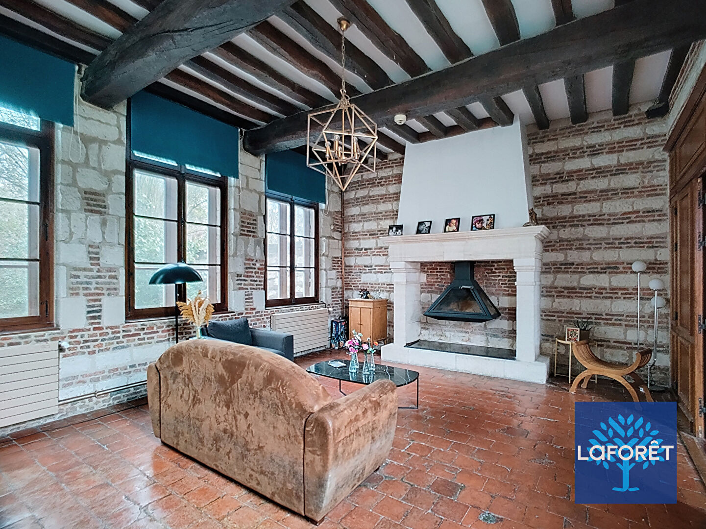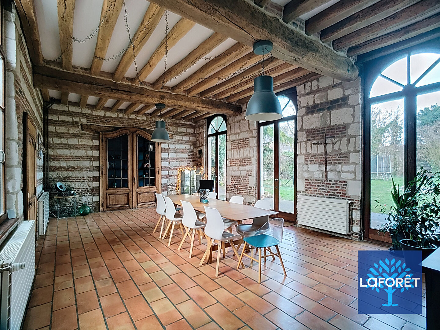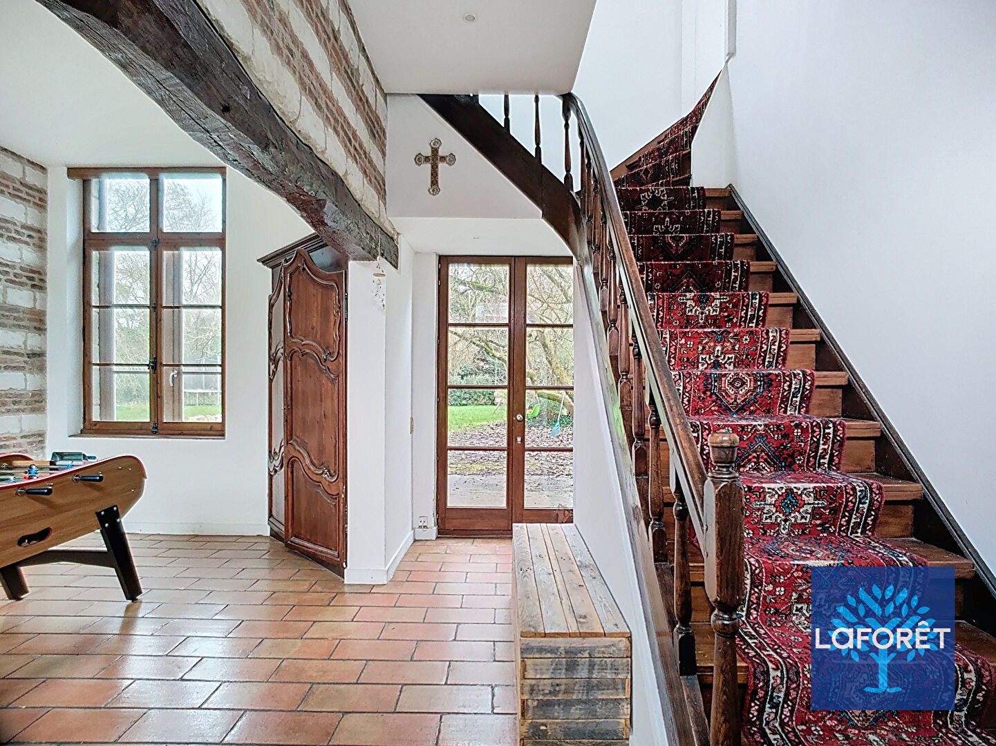 Dès l'entrée, vous serez accueilli par un vaste hall doté d'un double escalier desservant les étages. Le rez-de-chaussée offre un chaleureux salon avec poêle à bois, un salon TV indépendant, une salle à manger lumineuse ouverte sur le jardin, une cuisine entièrement équipée, ainsi qu'un cellier et une buanderie.