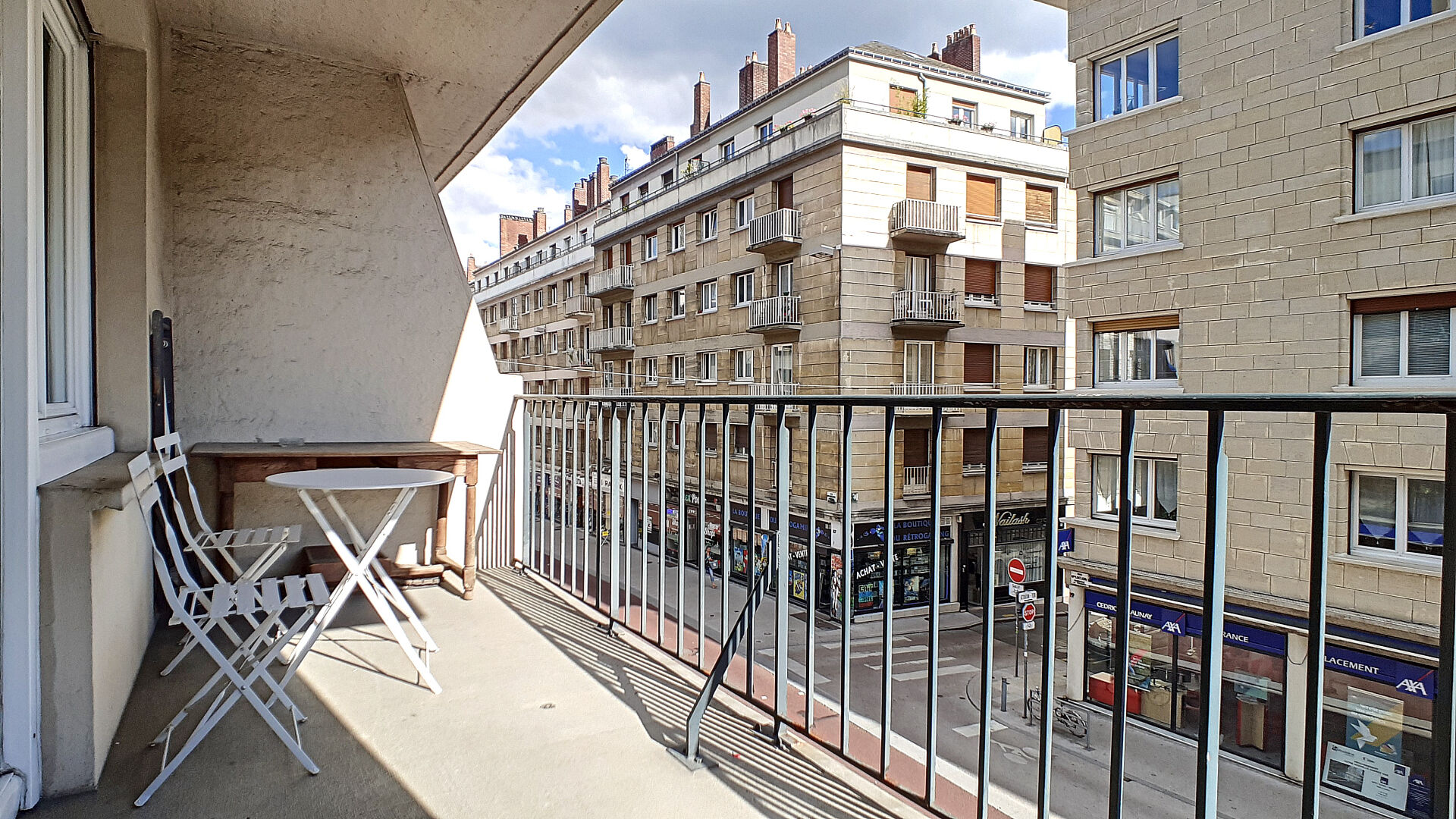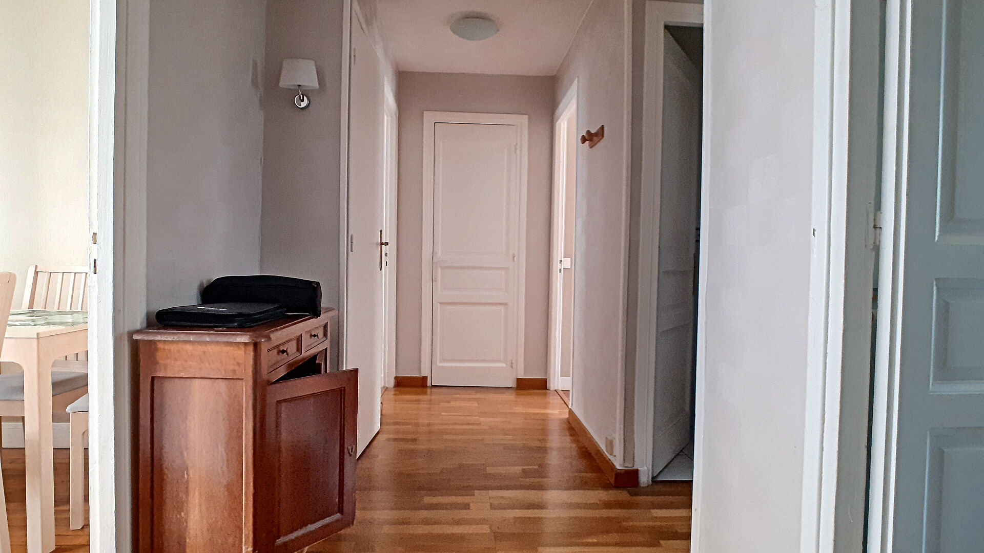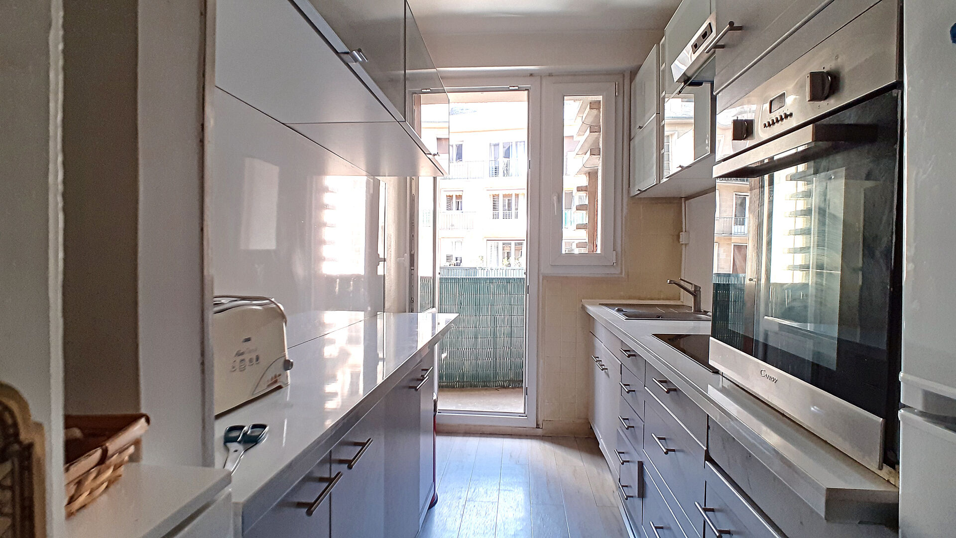Il se situe au deuxième étage d'un immeuble de bon standing. Ce dernier est équipé d'un ascenseur. Le bâtiment est équipé d'un interphone. Un gardien est aussi présent. Il propose un grand séjour/salon avec un accès balcon, deux chambres avec placards et une cuisine aménagée et équipée avec un accès balcon (four, plaque de cuisson, hotte, réfrigérateur, machine à laver et sèche linge) ainsi qu'une salle de bain. WC séparé.