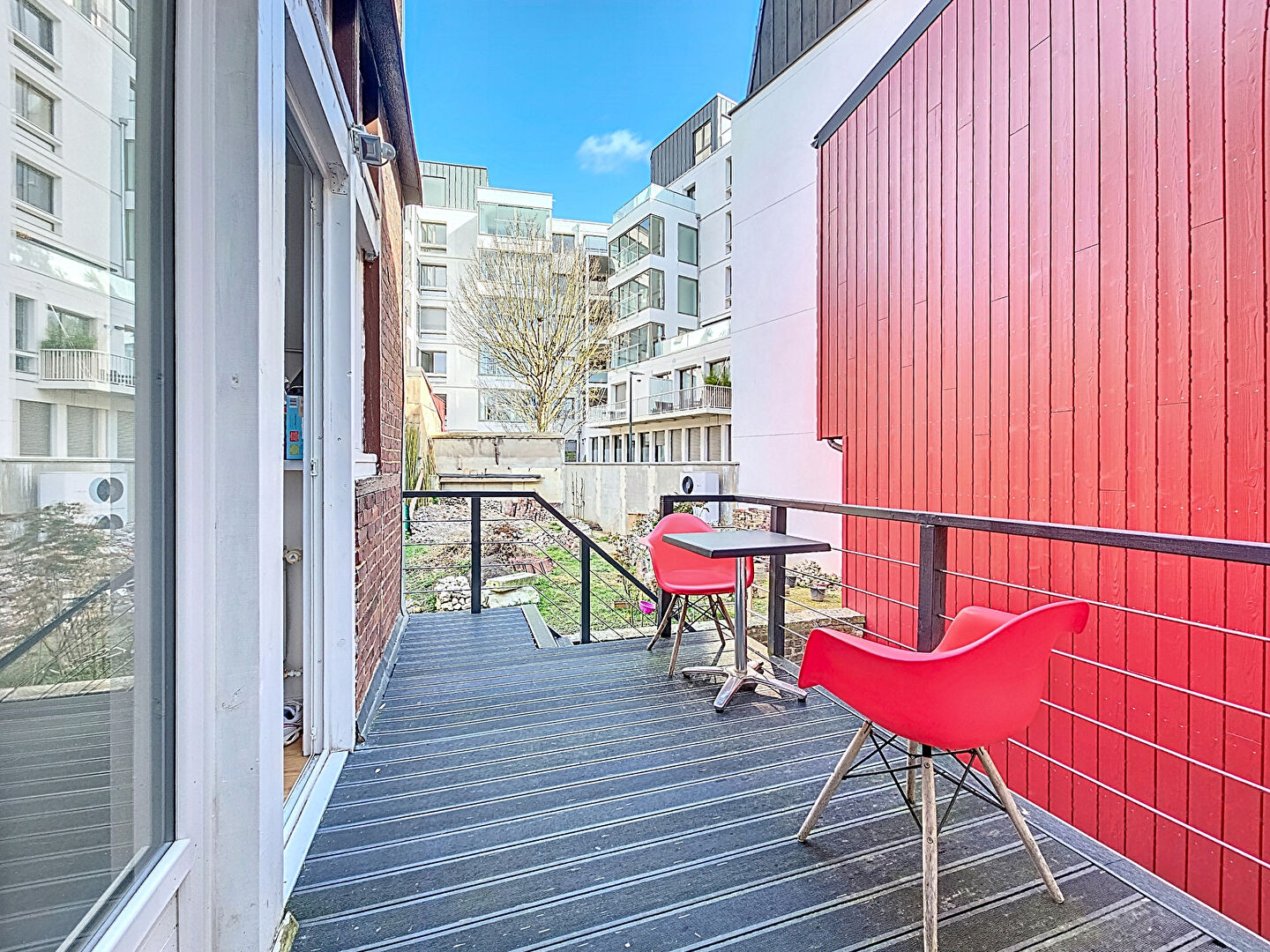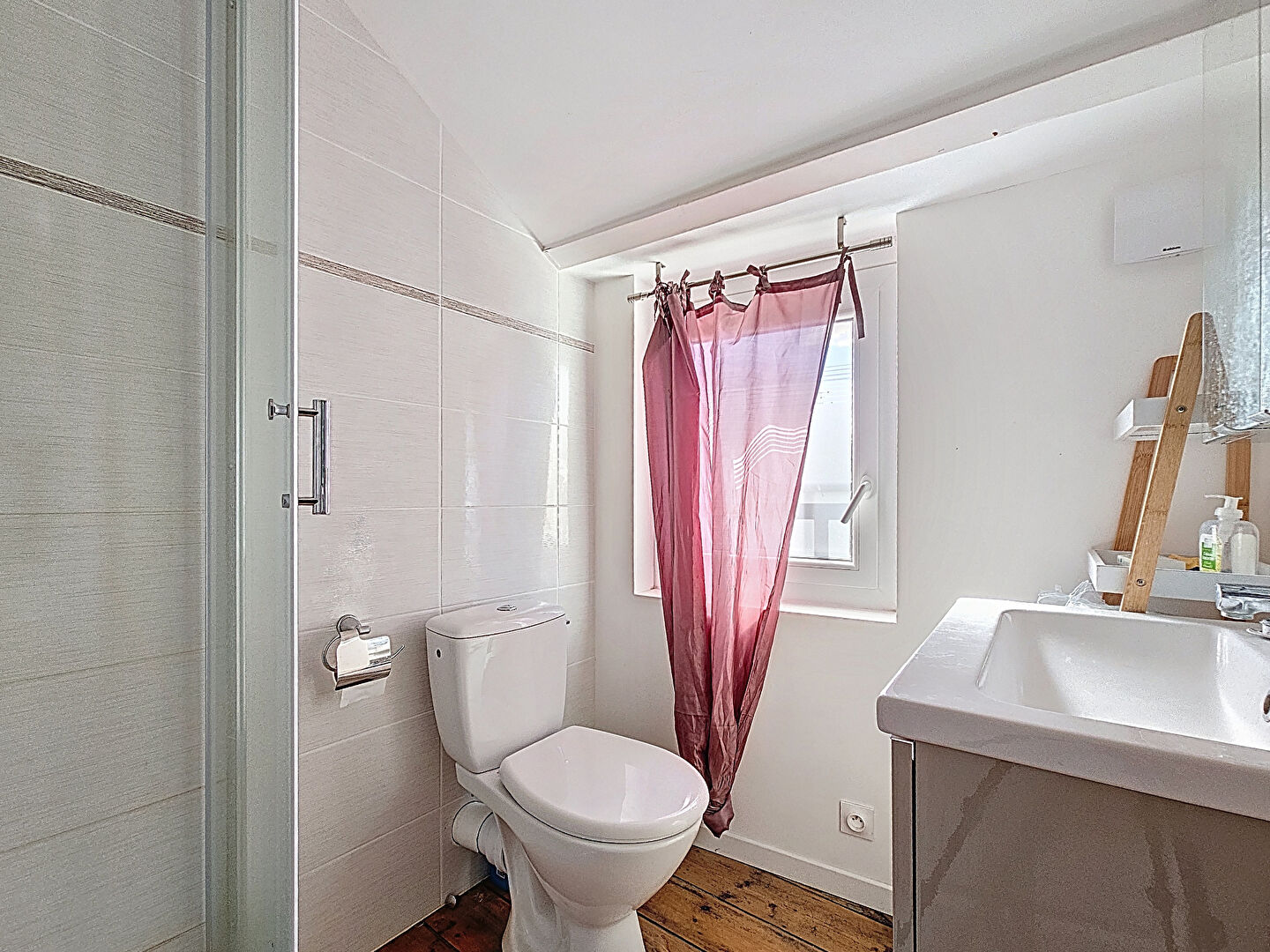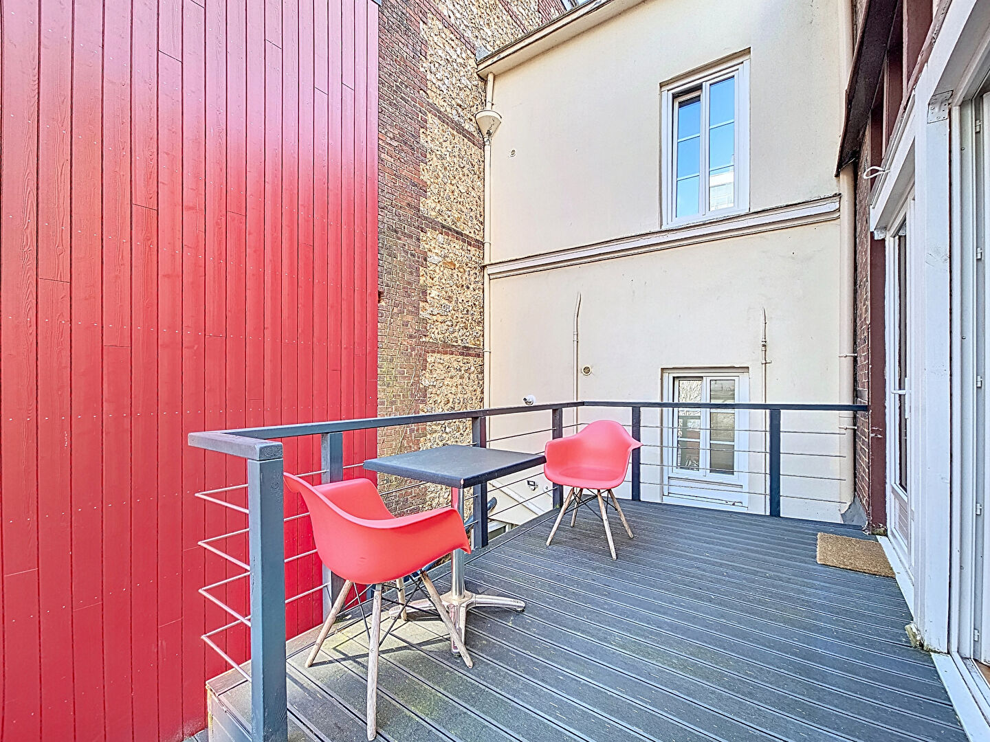 La maison principale est actuellement louée à la chambre. Au premier niveau, on trouve une pièce de vie avec cuisine ouverte sur le séjour, ainsi que deux chambres et une salle de bains. À l'étage, deux chambres supplémentaires et une salle de bains complètent l'espace. Une terrasse au calme, à l'écart de la rue, vient agrémenter l'ensemble.
