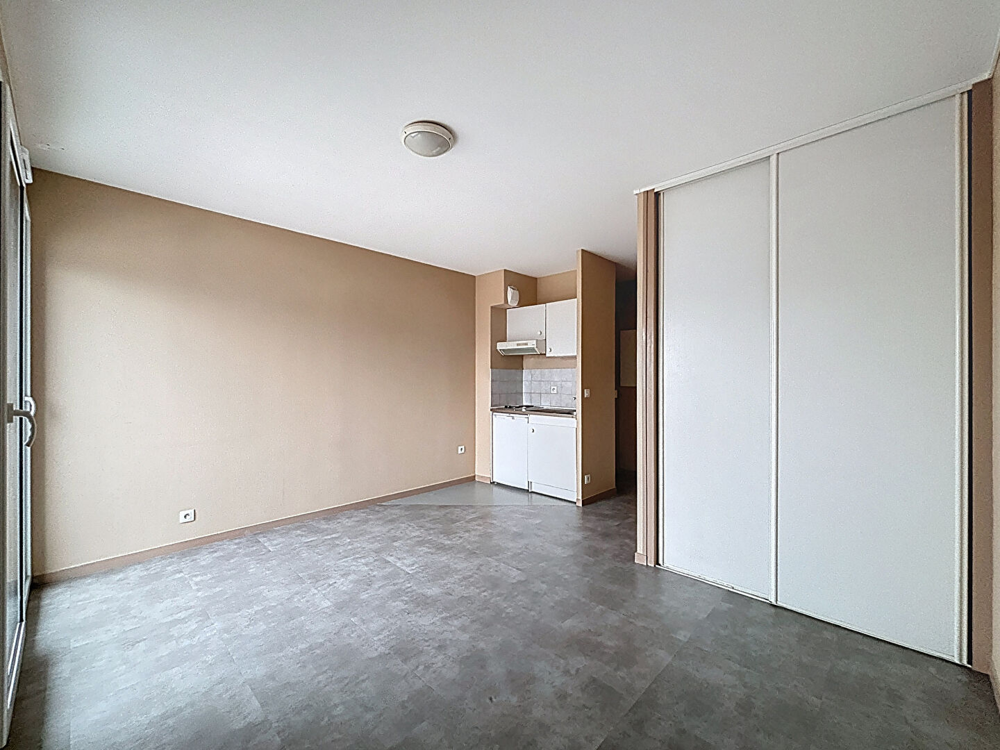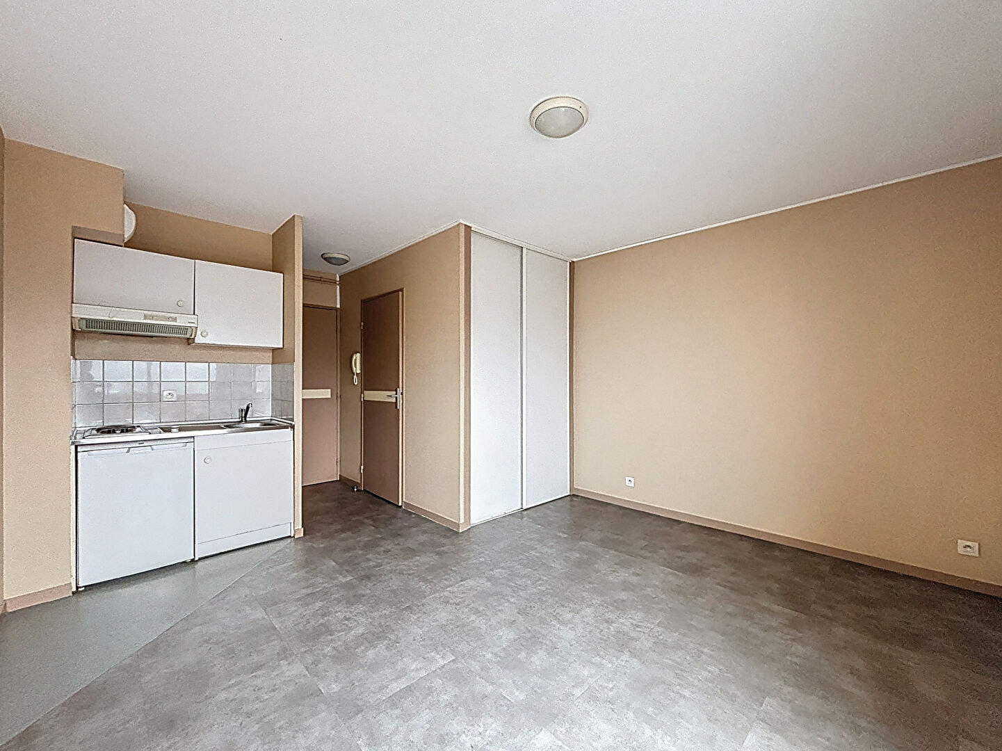 Studio composé d'une entrée, pièce de vie principale avec cuisine aménagée et équipée (plaques de cuisson, hotte et réfrigérateur), placard de rangement avec machine à laver intégrée, salle de bains et un WC.