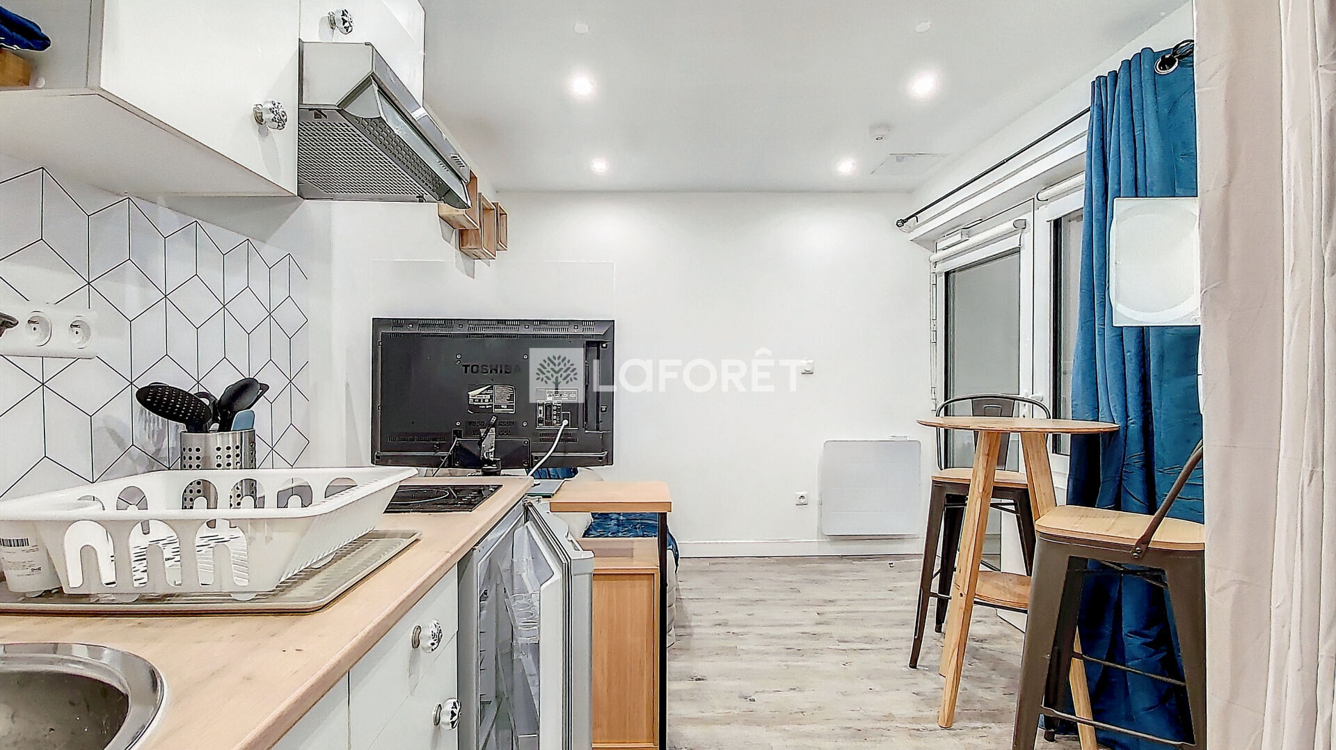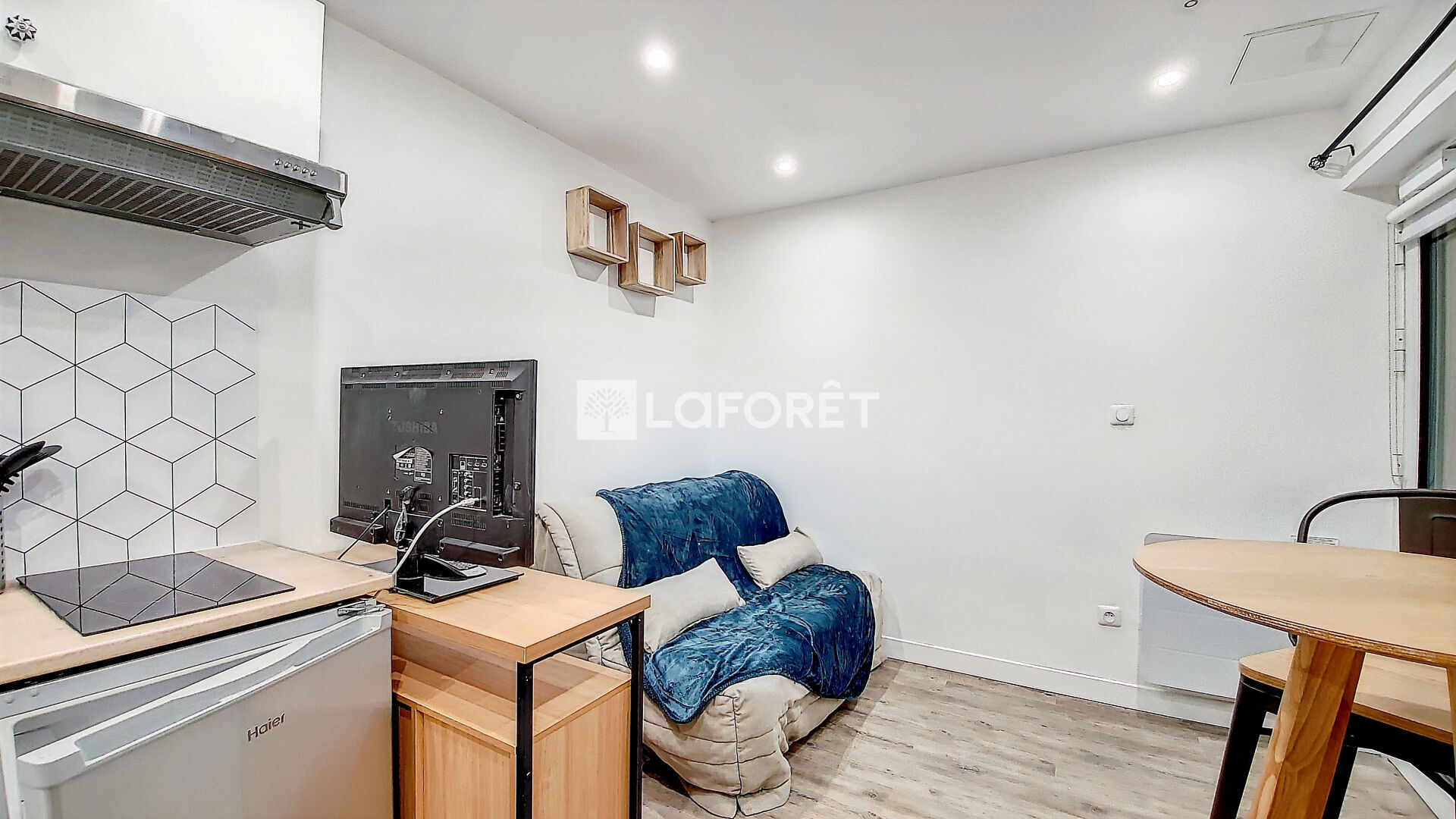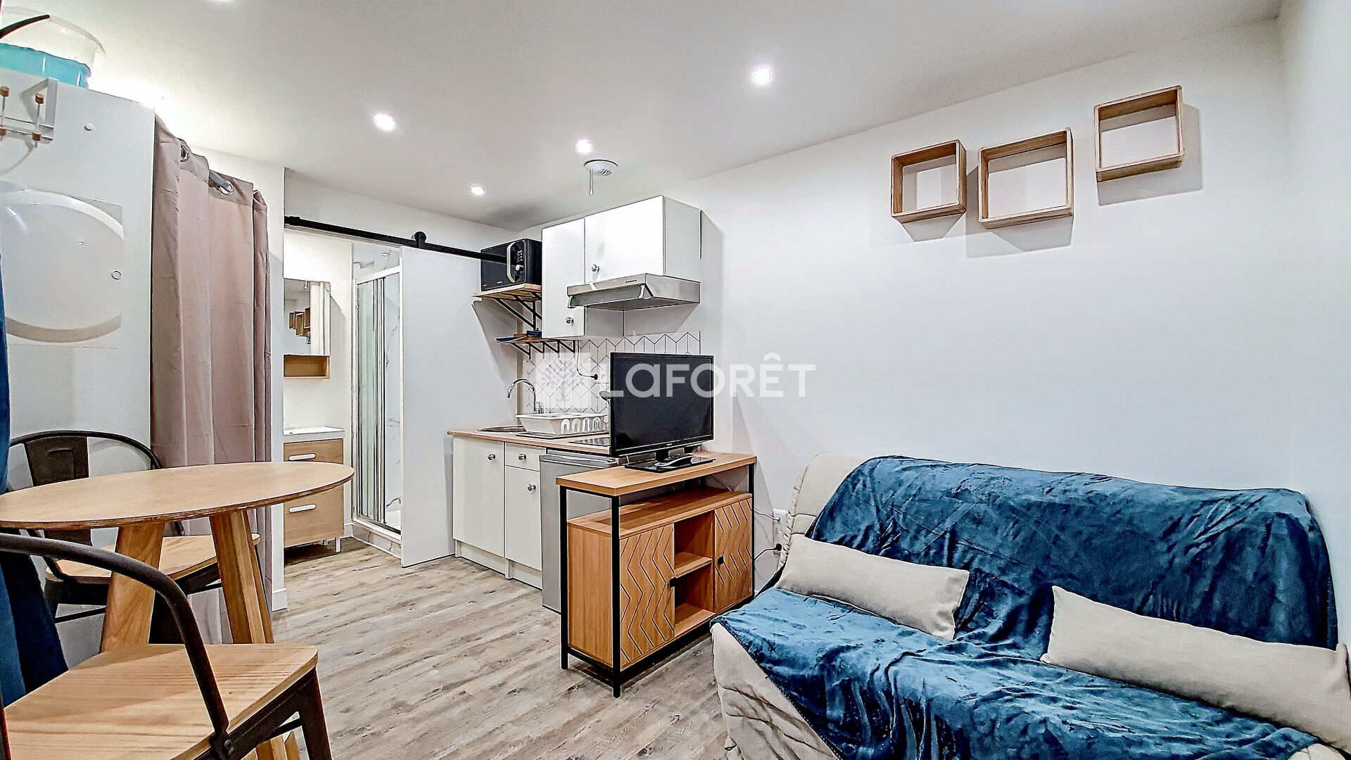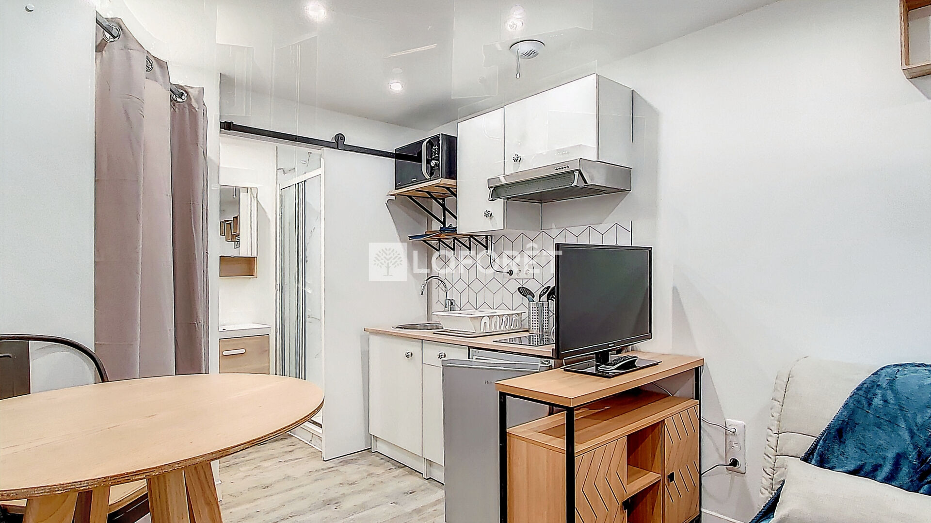 Studio meublé en très bon état à la décoration soignée comprenant pièce principale, cuisine ouverte aménagée et équipée (frigo, plaque, hotte et micro-onde), une salle de douche avec WC.