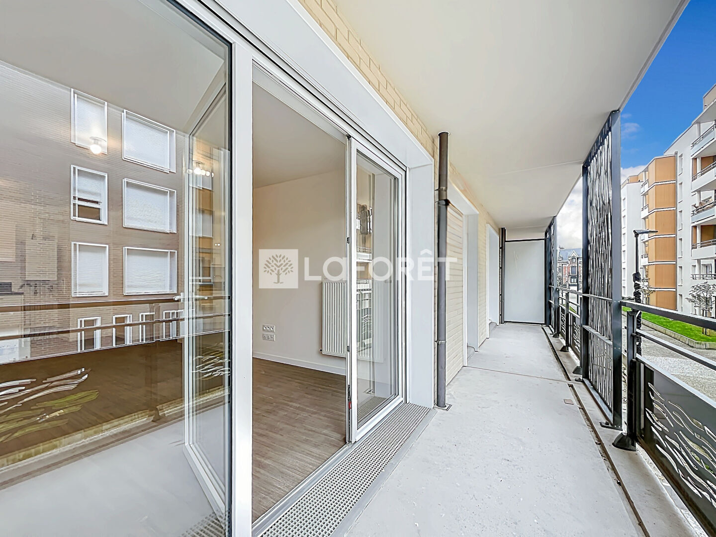 Il se compose d'une entrée avec placard, un séjour et une cuisine aménagée et équipée (plaque de cuisson et hotte), un accès à un balcon de 13.2 m², deux chambres donnant également sur le balcon, une salle de douche et des WC indépendants.