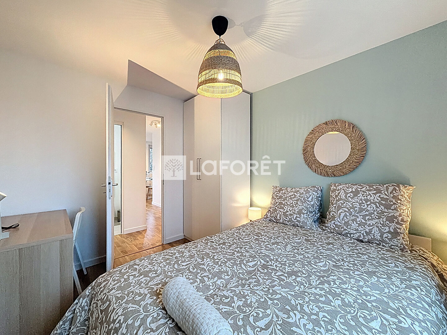 A louer dans votre agence, une chambre en colocation comprenant un espace de rangement, un lit et un bureau.